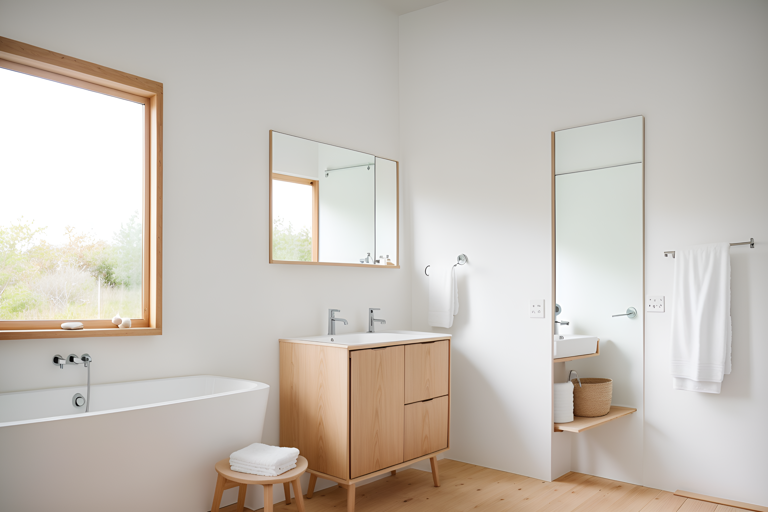 Photo from Pinterest of Airbnb-style interior designed bath room home interior With Simple, Clean Lines and Simplistic Furniture and Practicality and Functionality and Natural Materials and Elements and Scandinavian style and Simple Color Palette and Open and Natural Lighting and Neutral Walls and Textures and Simple, Clean Lines and Simplistic Furniture. With mirror and bathroom sink with faucet and bathtub and waste basket and toilet seat and bath towel and plant and bathroom cabinet and bath rail and shower. Cinematic photo, highly detailed, cinematic lighting, ultra-detailed, ultrarealistic, photorealism, 8k. Trending on Pinterest. Airbnb interior design style