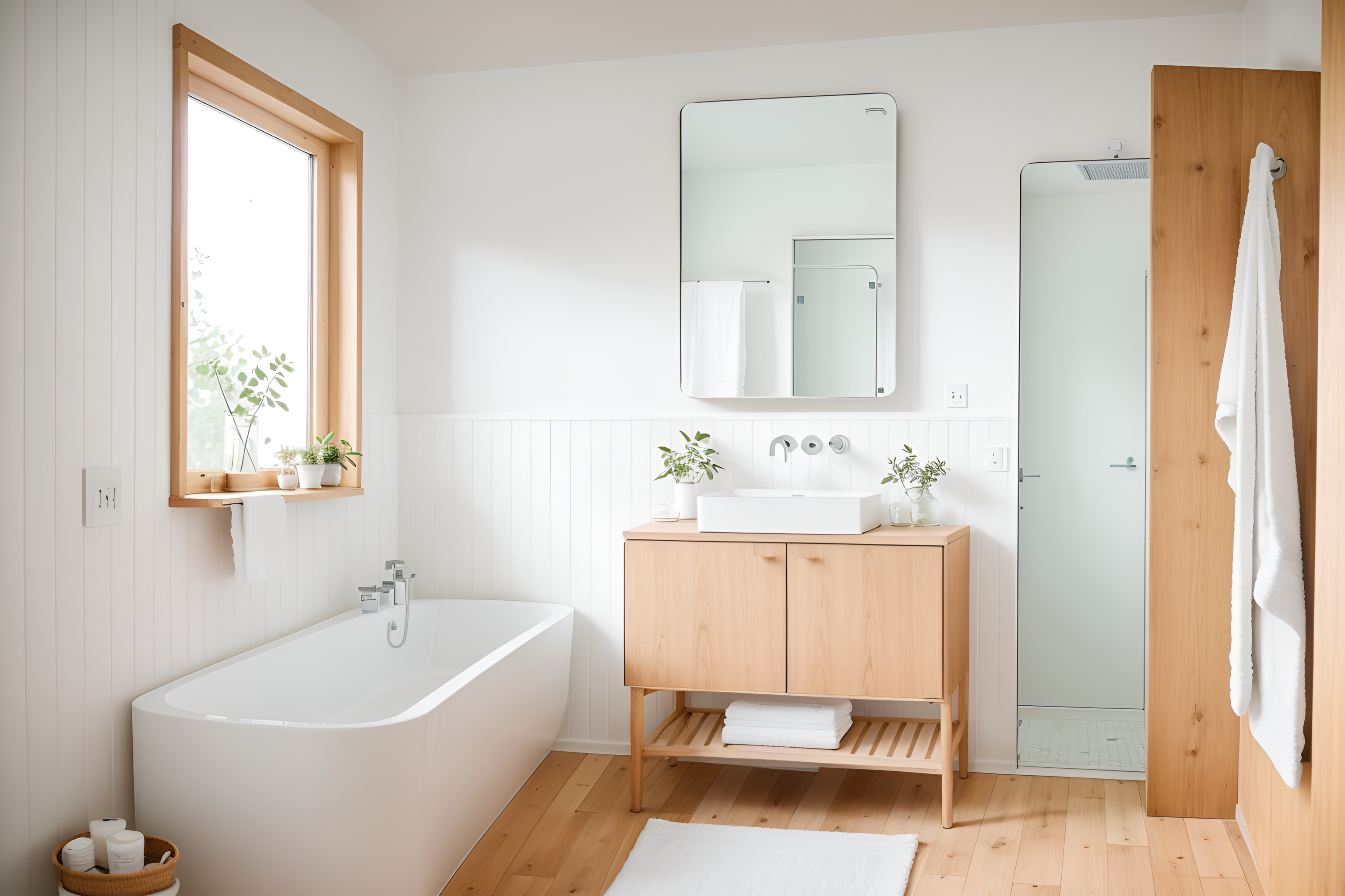 Photo from Pinterest of Airbnb-style interior designed bath room home interior With Simple, Clean Lines and Simplistic Furniture and Practicality and Functionality and Natural Materials and Elements and Scandinavian style and Simple Color Palette and Open and Natural Lighting and Neutral Walls and Textures and Simple, Clean Lines and Simplistic Furniture. With mirror and bathroom sink with faucet and bathtub and waste basket and toilet seat and bath towel and plant and bathroom cabinet and bath rail and shower. Cinematic photo, highly detailed, cinematic lighting, ultra-detailed, ultrarealistic, photorealism, 8k. Trending on Pinterest. Airbnb interior design style