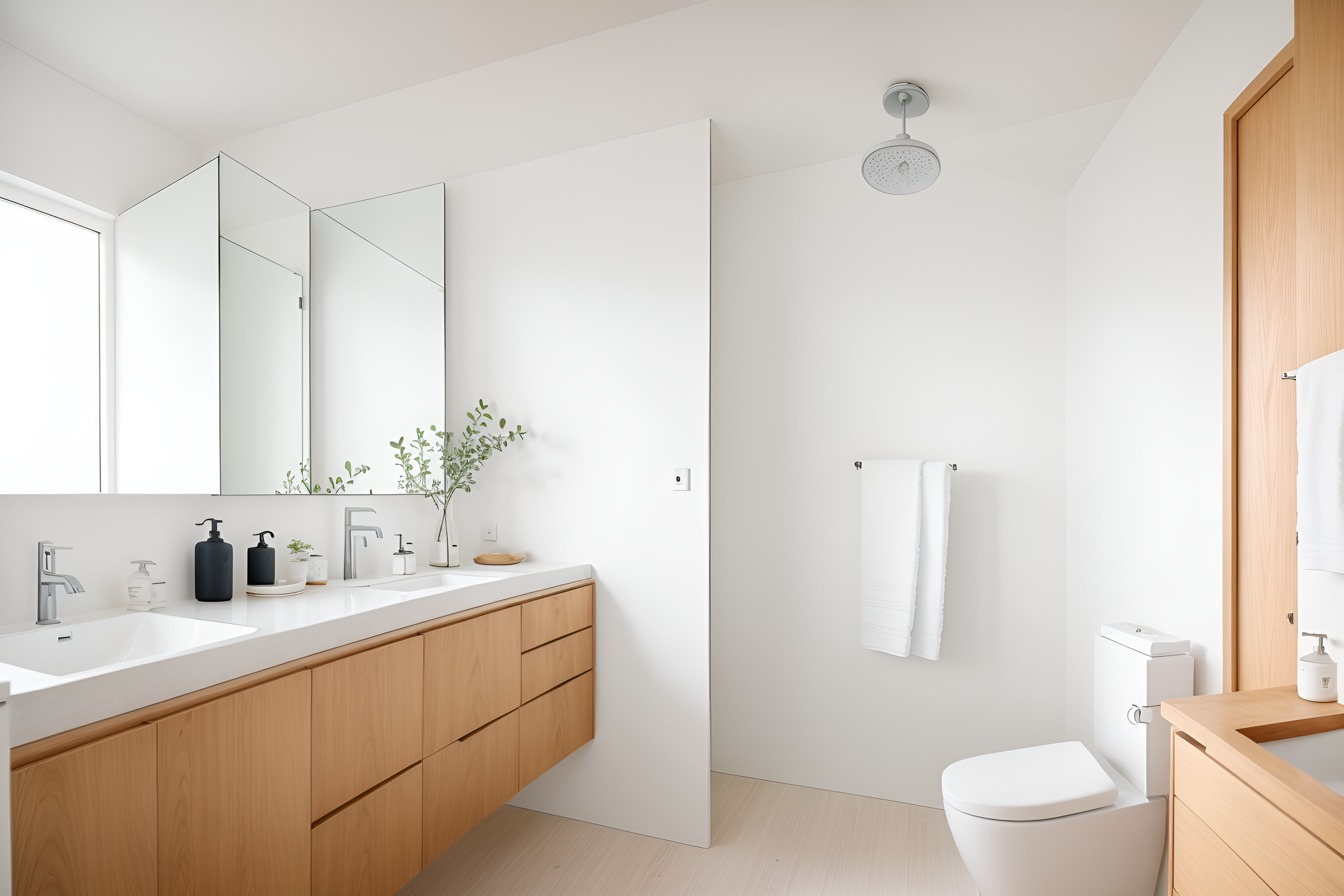 Photo from Pinterest of Airbnb-style interior designed bath room home interior With Simple, Clean Lines and Simplistic Furniture and Practicality and Functionality and Natural Materials and Elements and Scandinavian style and Simple Color Palette and Open and Natural Lighting and Neutral Walls and Textures and Simple, Clean Lines and Simplistic Furniture. With mirror and bathroom sink with faucet and bathtub and waste basket and toilet seat and bath towel and plant and bathroom cabinet and bath rail and shower. Cinematic photo, highly detailed, cinematic lighting, ultra-detailed, ultrarealistic, photorealism, 8k. Trending on Pinterest. Airbnb interior design style