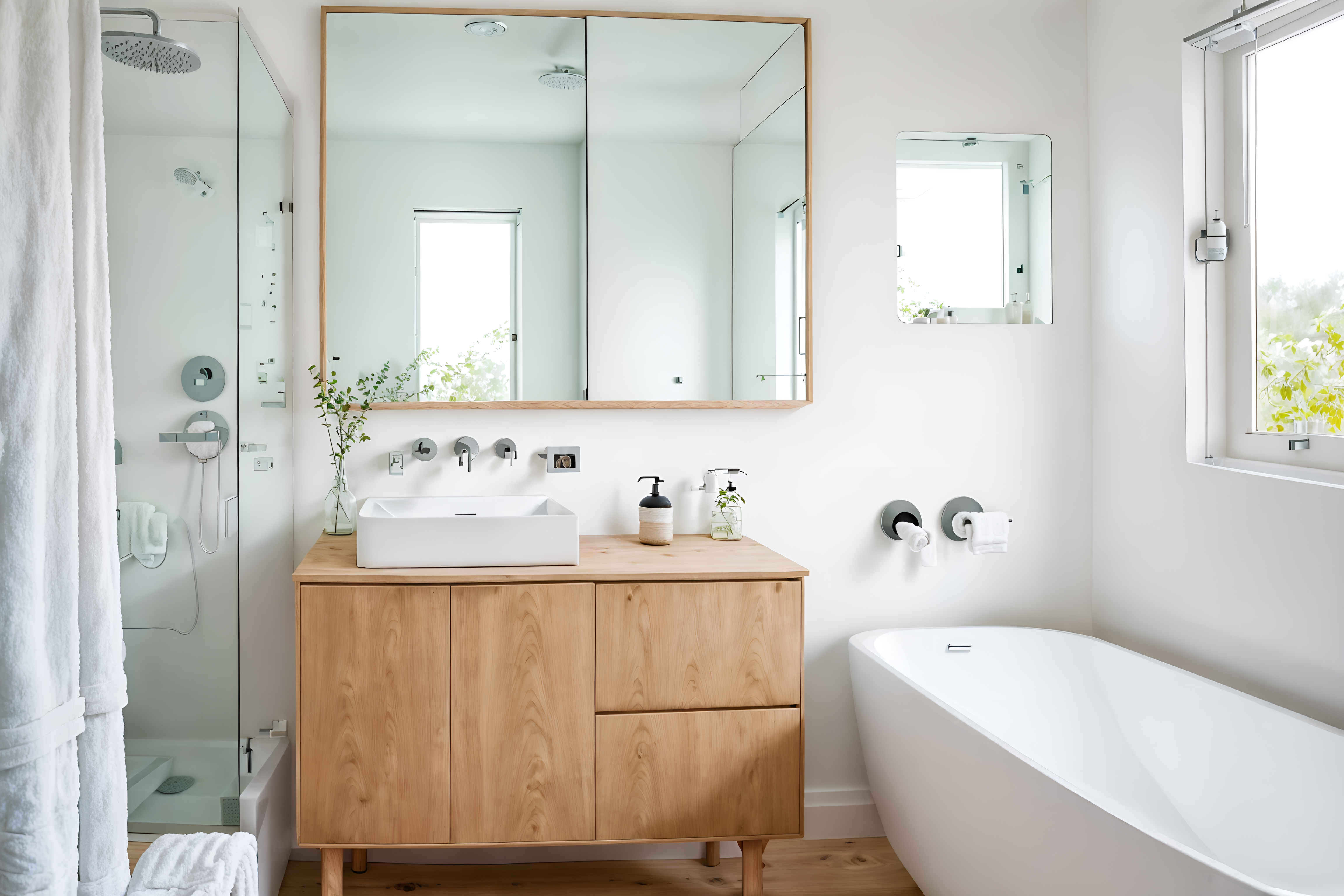 airbnb bathroomsinterior decorate this bathroom with airbnb style. . . with plant and mirror and bathtub and bathroom sink with faucet and bath towel and shower and waste basket and toilet seat. . with simple, clean lines and simplistic furniture and practicality and functionality and scandinavian style and neutral walls and textures and open and natural lighting and simple color palette and natural materials and elements and simple, clean lines and simplistic furniture. . .