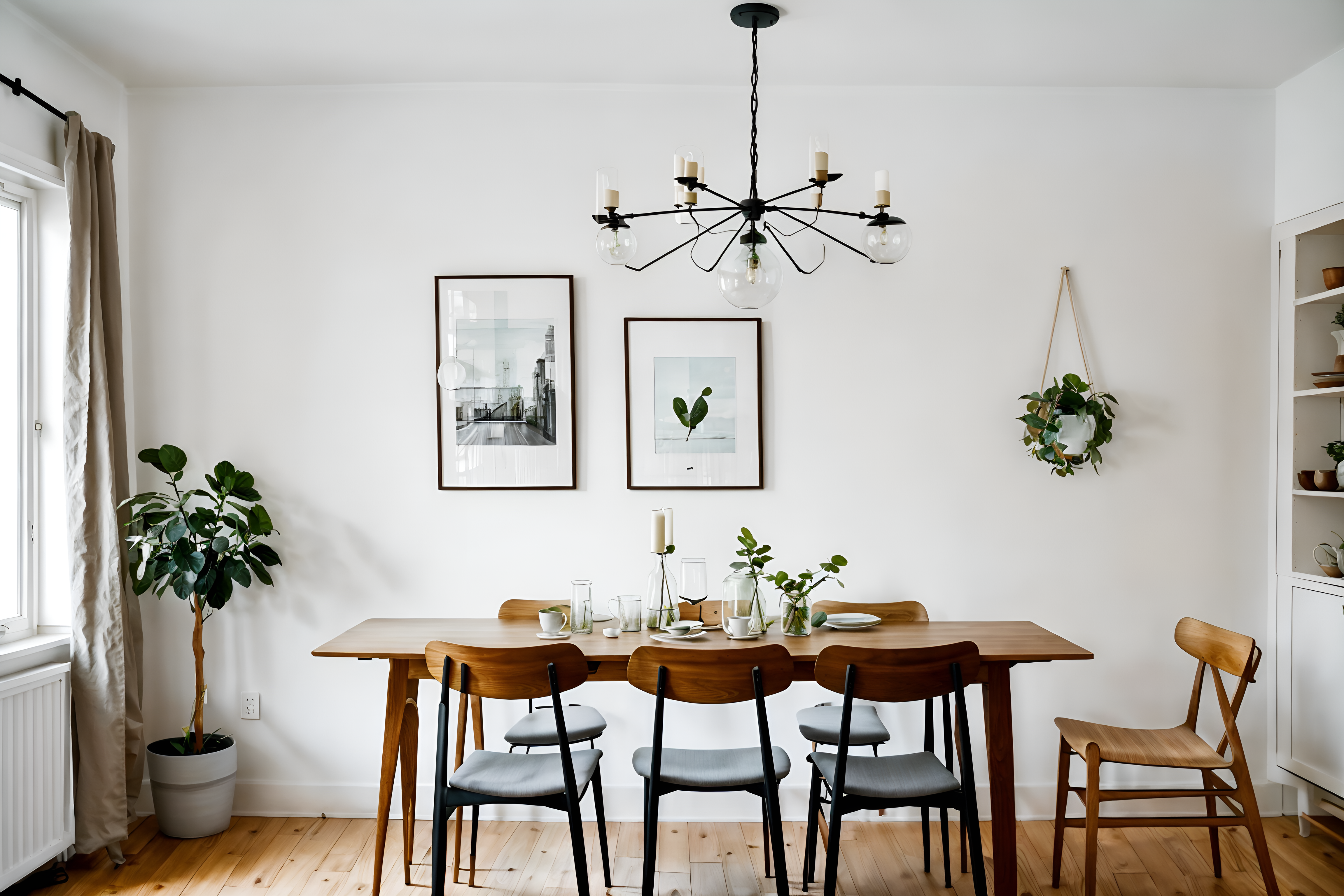 photo from pinterest of airbnb-style interior designed (dining room interior) with painting or photo on wall and light or chandelier and vase and dining table and plant and dining table chairs and table cloth and bookshelves. . with simple color palette and scandinavian style and simple, clean lines and simplistic furniture and natural materials and elements and open and natural lighting and neutral walls and textures and practicality and functionality and simple color palette. . cinematic photo, highly detailed, cinematic lighting, ultra-detailed, ultrarealistic, photorealism, 8k. trending on pinterest. airbnb interior design style. masterpiece, cinematic light, ultrarealistic+, photorealistic+, 8k, raw photo, realistic, sharp focus on eyes, (symmetrical eyes), (intact eyes), hyperrealistic, highest quality, best quality, , highly detailed, masterpiece, best quality, extremely detailed 8k wallpaper, masterpiece, best quality, ultra-detailed, best shadow, detailed background, detailed face, detailed eyes, high contrast, best illumination, detailed face, dulux, caustic, dynamic angle, detailed glow. dramatic lighting. highly detailed, insanely detailed hair, symmetrical, intricate details, professionally retouched, 8k high definition. strong bokeh. award winning photo.