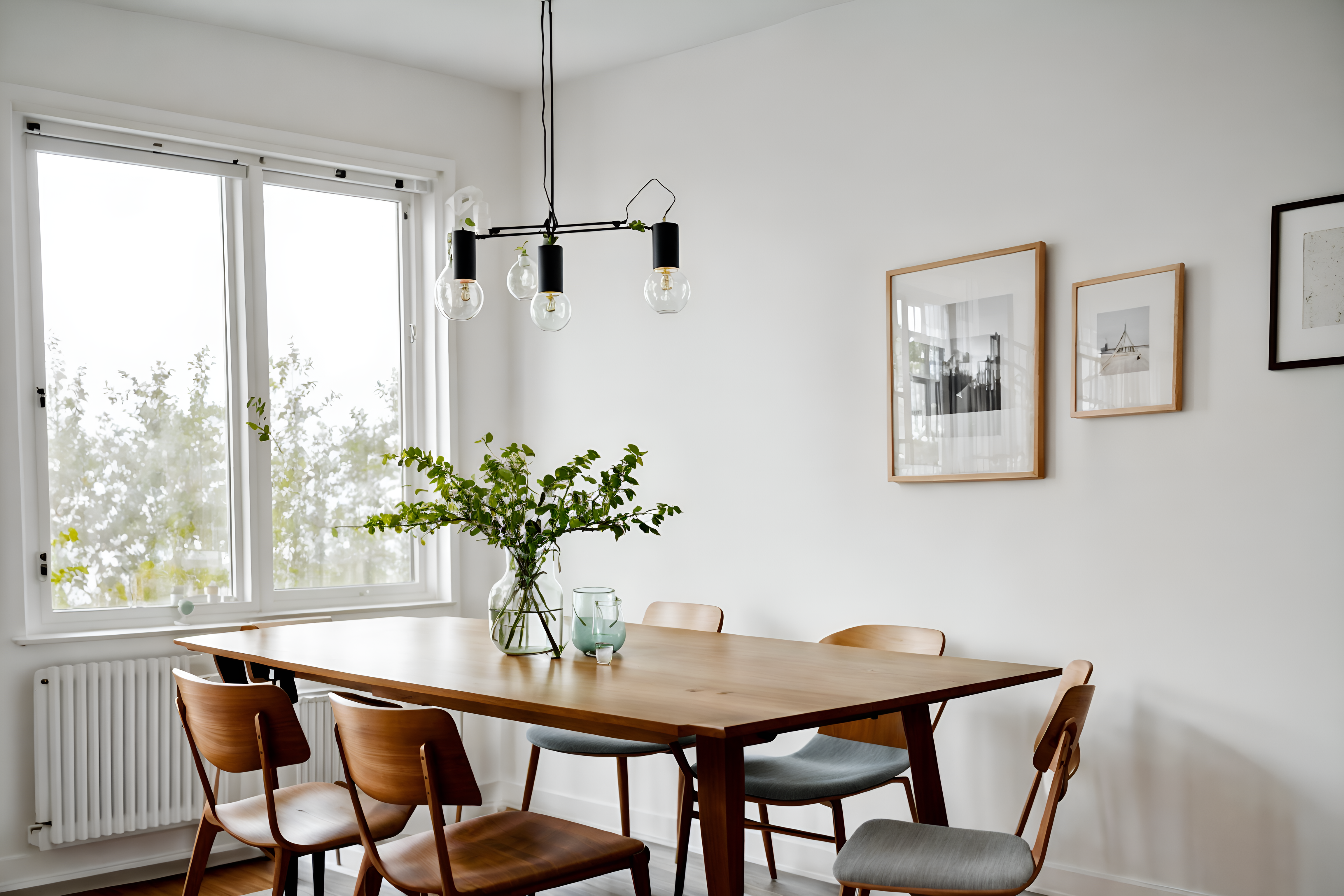 photo from pinterest of airbnb-style interior designed (dining room interior) with painting or photo on wall and light or chandelier and vase and dining table and plant and dining table chairs and table cloth and bookshelves. . with simple color palette and scandinavian style and simple, clean lines and simplistic furniture and natural materials and elements and open and natural lighting and neutral walls and textures and practicality and functionality and simple color palette. . cinematic photo, highly detailed, cinematic lighting, ultra-detailed, ultrarealistic, photorealism, 8k. trending on pinterest. airbnb interior design style. masterpiece, cinematic light, ultrarealistic+, photorealistic+, 8k, raw photo, realistic, sharp focus on eyes, (symmetrical eyes), (intact eyes), hyperrealistic, highest quality, best quality, , highly detailed, masterpiece, best quality, extremely detailed 8k wallpaper, masterpiece, best quality, ultra-detailed, best shadow, detailed background, detailed face, detailed eyes, high contrast, best illumination, detailed face, dulux, caustic, dynamic angle, detailed glow. dramatic lighting. highly detailed, insanely detailed hair, symmetrical, intricate details, professionally retouched, 8k high definition. strong bokeh. award winning photo.