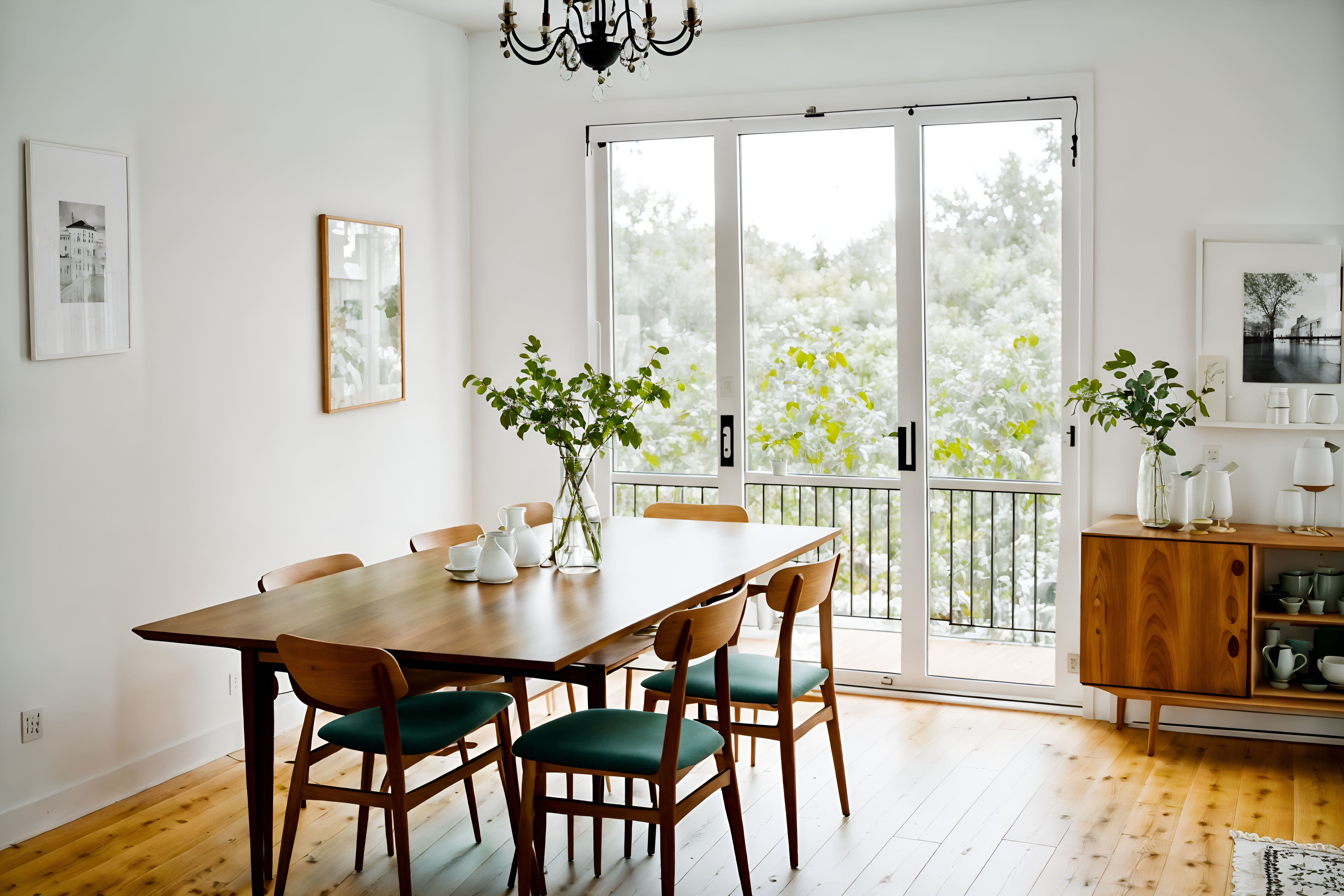 photo from pinterest of airbnb-style interior designed (dining room interior) with painting or photo on wall and light or chandelier and vase and dining table and plant and dining table chairs and table cloth and bookshelves. . with simple color palette and scandinavian style and simple, clean lines and simplistic furniture and natural materials and elements and open and natural lighting and neutral walls and textures and practicality and functionality and simple color palette. . cinematic photo, highly detailed, cinematic lighting, ultra-detailed, ultrarealistic, photorealism, 8k. trending on pinterest. airbnb interior design style. masterpiece, cinematic light, ultrarealistic+, photorealistic+, 8k, raw photo, realistic, sharp focus on eyes, (symmetrical eyes), (intact eyes), hyperrealistic, highest quality, best quality, , highly detailed, masterpiece, best quality, extremely detailed 8k wallpaper, masterpiece, best quality, ultra-detailed, best shadow, detailed background, detailed face, detailed eyes, high contrast, best illumination, detailed face, dulux, caustic, dynamic angle, detailed glow. dramatic lighting. highly detailed, insanely detailed hair, symmetrical, intricate details, professionally retouched, 8k high definition. strong bokeh. award winning photo.