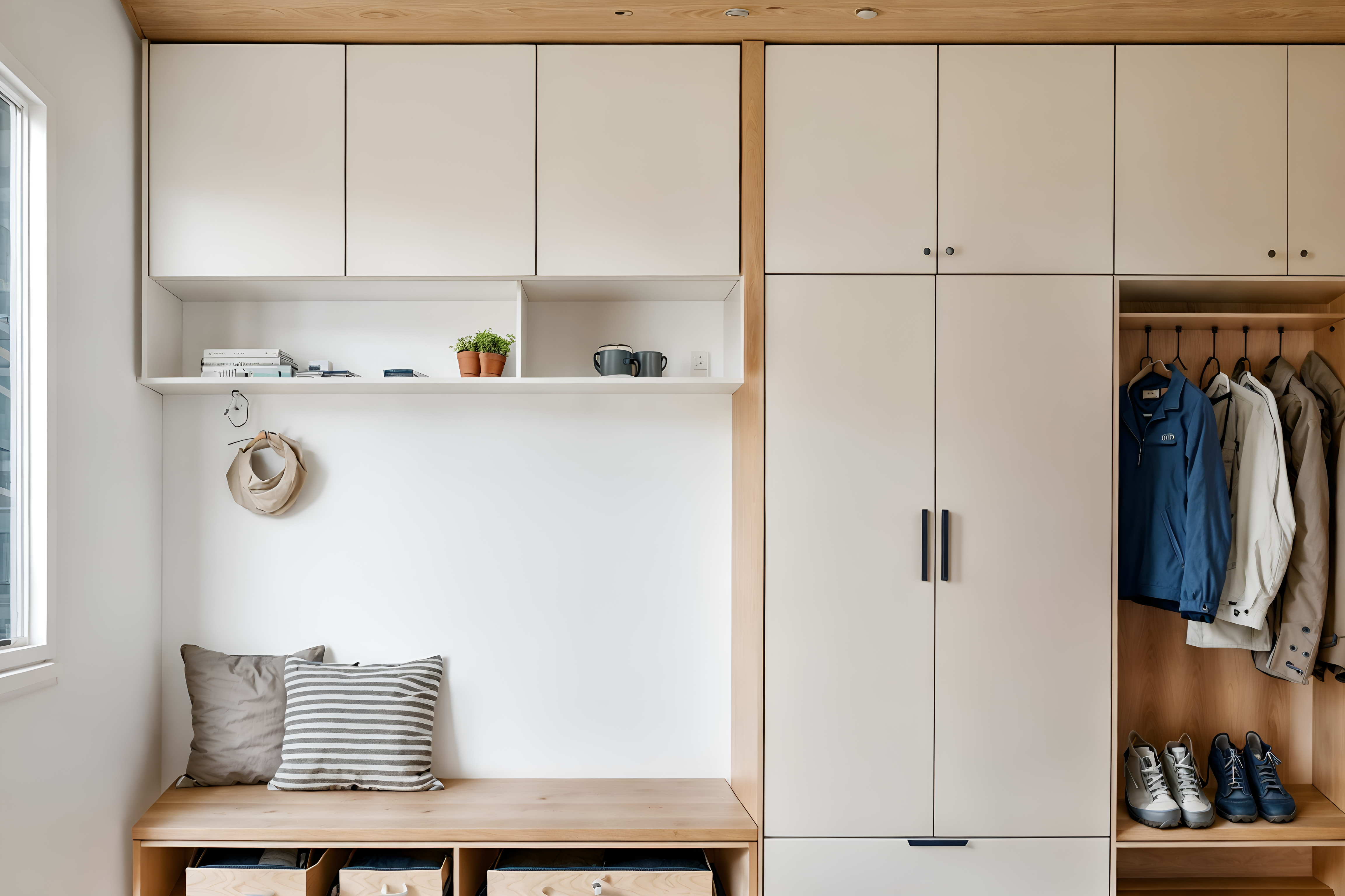 photo from pinterest of airbnb-style interior designed (drop zone interior) with a bench and cubbies and cabinets and wall hooks for coats and storage drawers and shelves for shoes and storage baskets and lockers. . with practicality and functionality and open and natural lighting and neutral walls and textures and natural materials and elements and scandinavian style and simple, clean lines and simplistic furniture and simple color palette and practicality and functionality. . cinematic photo, highly detailed, cinematic lighting, ultra-detailed, ultrarealistic, photorealism, 8k. trending on pinterest. airbnb interior design style. masterpiece, cinematic light, ultrarealistic+, photorealistic+, 8k, raw photo, realistic, sharp focus on eyes, (symmetrical eyes), (intact eyes), hyperrealistic, highest quality, best quality, , highly detailed, masterpiece, best quality, extremely detailed 8k wallpaper, masterpiece, best quality, ultra-detailed, best shadow, detailed background, detailed face, detailed eyes, high contrast, best illumination, detailed face, dulux, caustic, dynamic angle, detailed glow. dramatic lighting. highly detailed, insanely detailed hair, symmetrical, intricate details, professionally retouched, 8k high definition. strong bokeh. award winning photo.