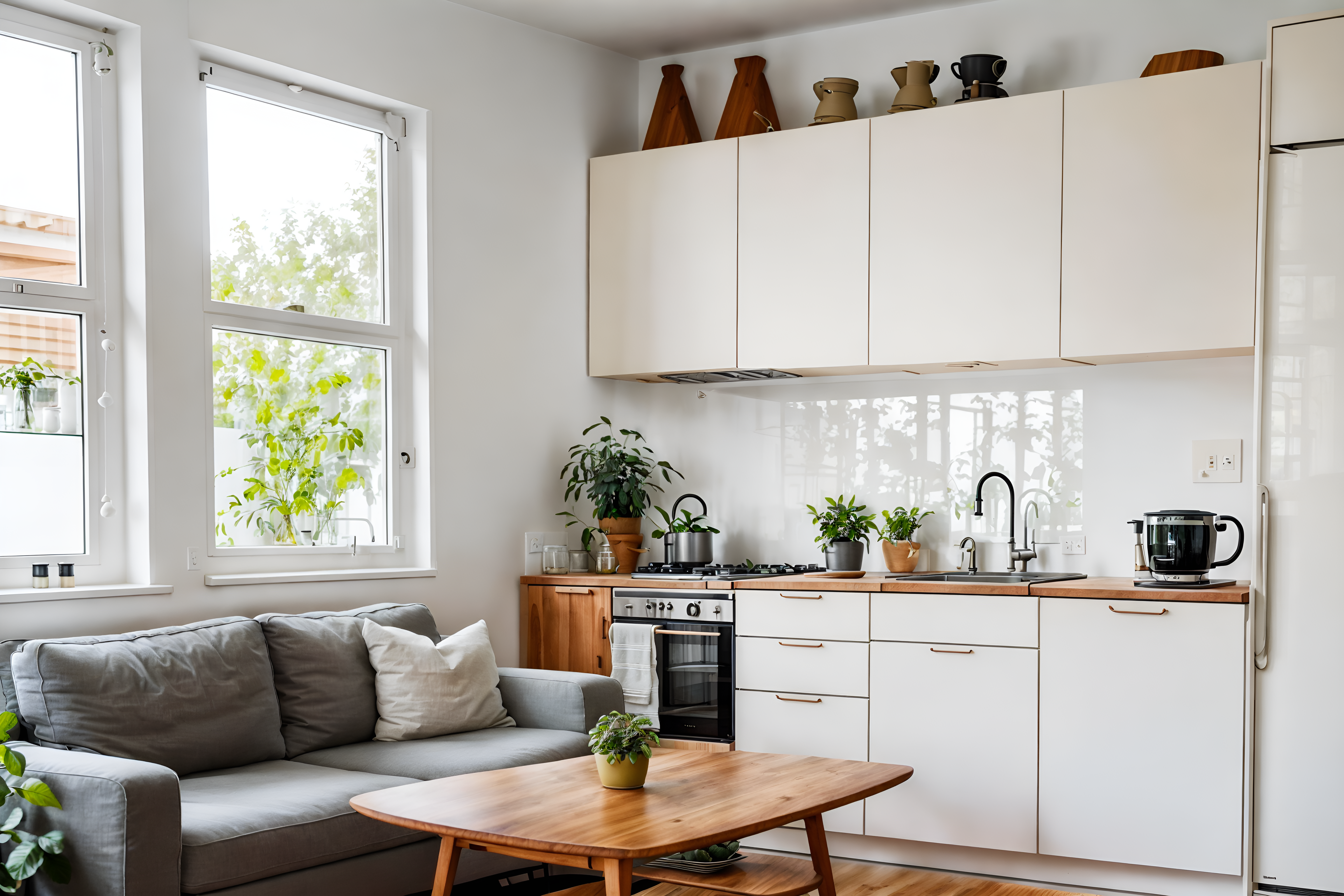 photo from pinterest of airbnb-style interior designed (kitchen living combo interior) with furniture and sink and occasional tables and refrigerator and coffee tables and worktops and sofa and plant. . with scandinavian style and natural materials and elements and simple color palette and practicality and functionality and neutral walls and textures and simple, clean lines and simplistic furniture and open and natural lighting and scandinavian style. . cinematic photo, highly detailed, cinematic lighting, ultra-detailed, ultrarealistic, photorealism, 8k. trending on pinterest. airbnb interior design style. masterpiece, cinematic light, ultrarealistic+, photorealistic+, 8k, raw photo, realistic, sharp focus on eyes, (symmetrical eyes), (intact eyes), hyperrealistic, highest quality, best quality, , highly detailed, masterpiece, best quality, extremely detailed 8k wallpaper, masterpiece, best quality, ultra-detailed, best shadow, detailed background, detailed face, detailed eyes, high contrast, best illumination, detailed face, dulux, caustic, dynamic angle, detailed glow. dramatic lighting. highly detailed, insanely detailed hair, symmetrical, intricate details, professionally retouched, 8k high definition. strong bokeh. award winning photo.