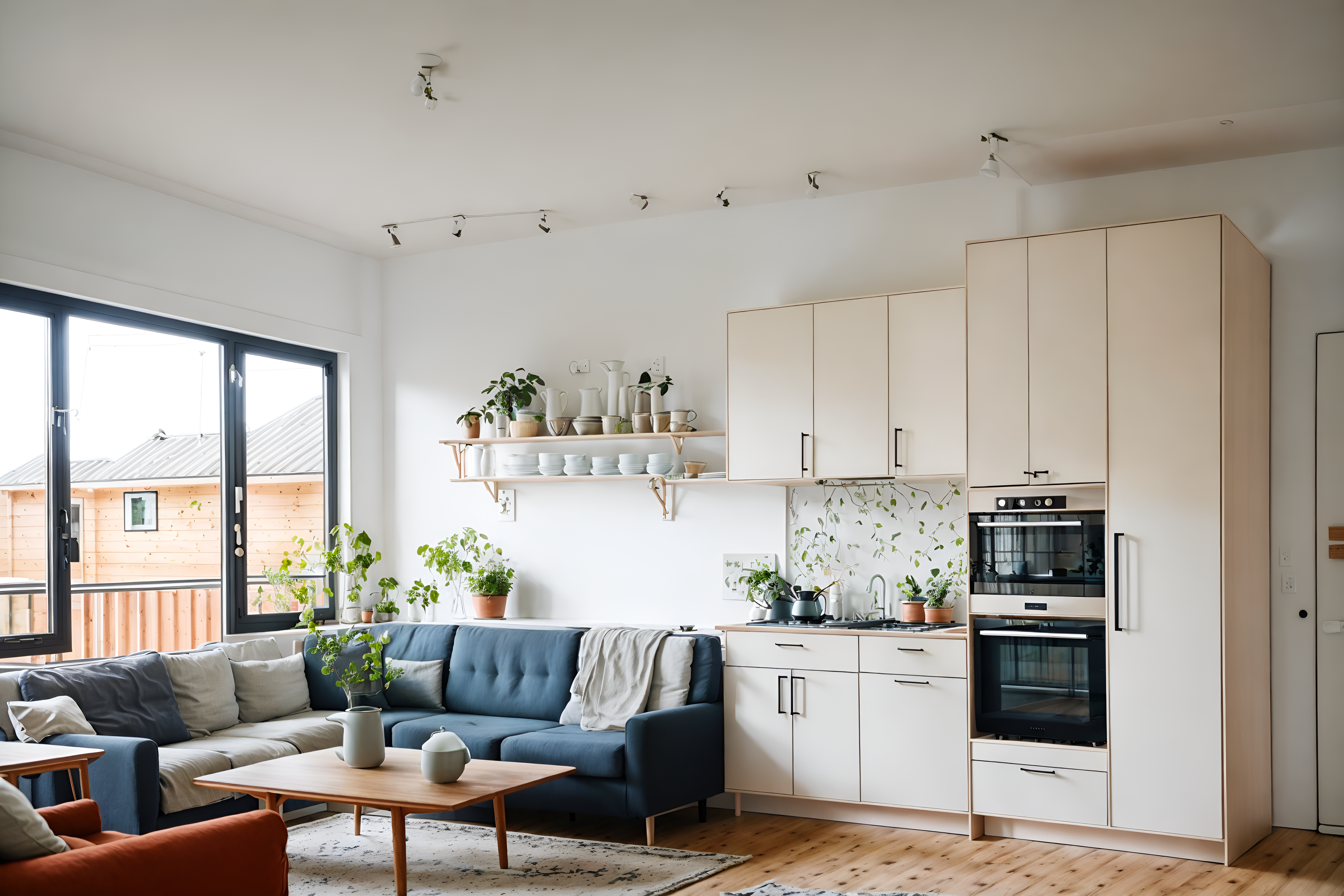 photo from pinterest of airbnb-style interior designed (kitchen living combo interior) with furniture and sink and occasional tables and refrigerator and coffee tables and worktops and sofa and plant. . with scandinavian style and natural materials and elements and simple color palette and practicality and functionality and neutral walls and textures and simple, clean lines and simplistic furniture and open and natural lighting and scandinavian style. . cinematic photo, highly detailed, cinematic lighting, ultra-detailed, ultrarealistic, photorealism, 8k. trending on pinterest. airbnb interior design style. masterpiece, cinematic light, ultrarealistic+, photorealistic+, 8k, raw photo, realistic, sharp focus on eyes, (symmetrical eyes), (intact eyes), hyperrealistic, highest quality, best quality, , highly detailed, masterpiece, best quality, extremely detailed 8k wallpaper, masterpiece, best quality, ultra-detailed, best shadow, detailed background, detailed face, detailed eyes, high contrast, best illumination, detailed face, dulux, caustic, dynamic angle, detailed glow. dramatic lighting. highly detailed, insanely detailed hair, symmetrical, intricate details, professionally retouched, 8k high definition. strong bokeh. award winning photo.