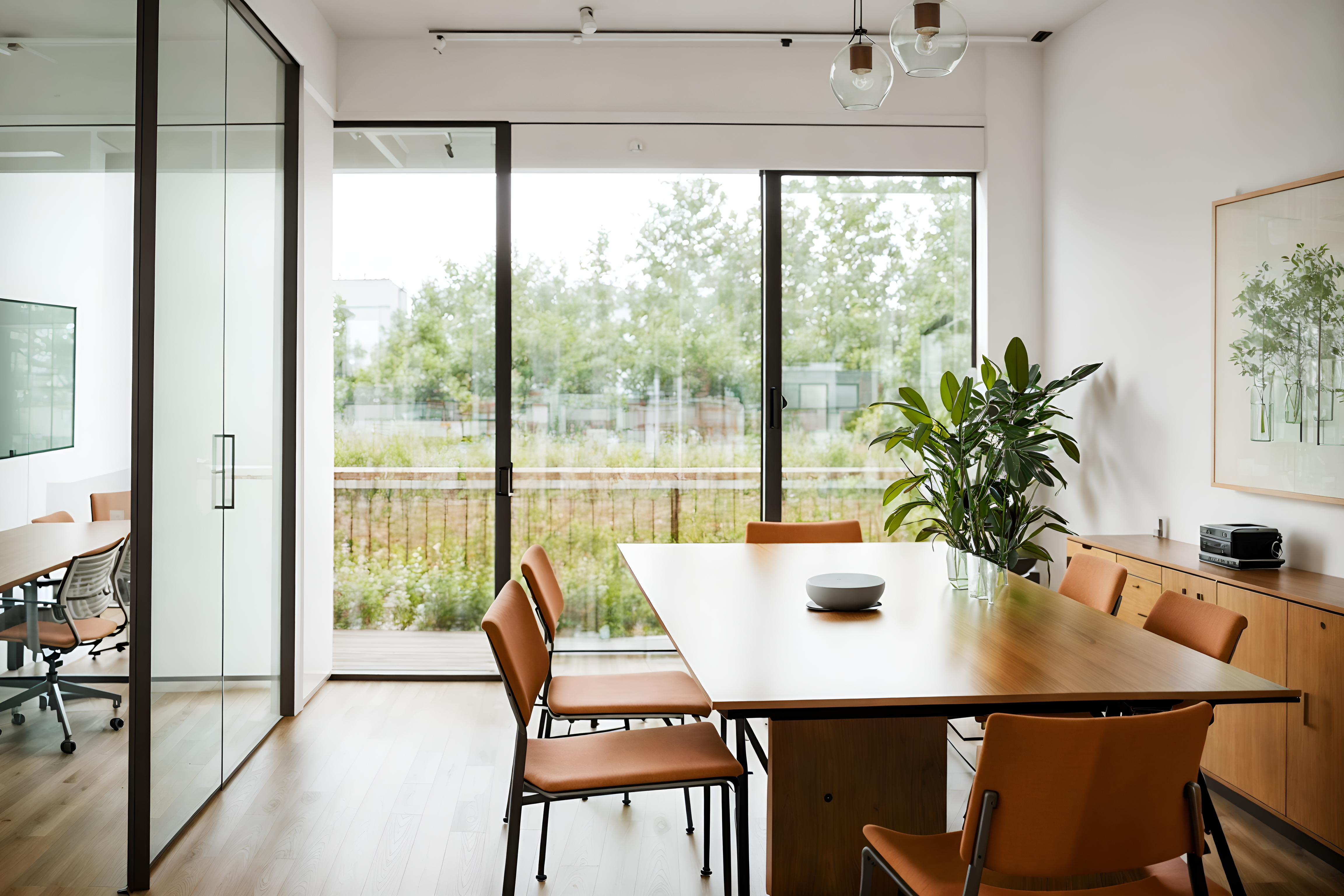 airbnb meeting roomsinterior decorate this meeting room with airbnb style. . . with glass walls and boardroom table and plant and office chairs and glass doors and painting or photo on wall and cabinets and vase. . with simple color palette and open and natural lighting and practicality and functionality and natural materials and elements and simple, clean lines and simplistic furniture and neutral walls and textures and scandinavian style and simple color palette. . .