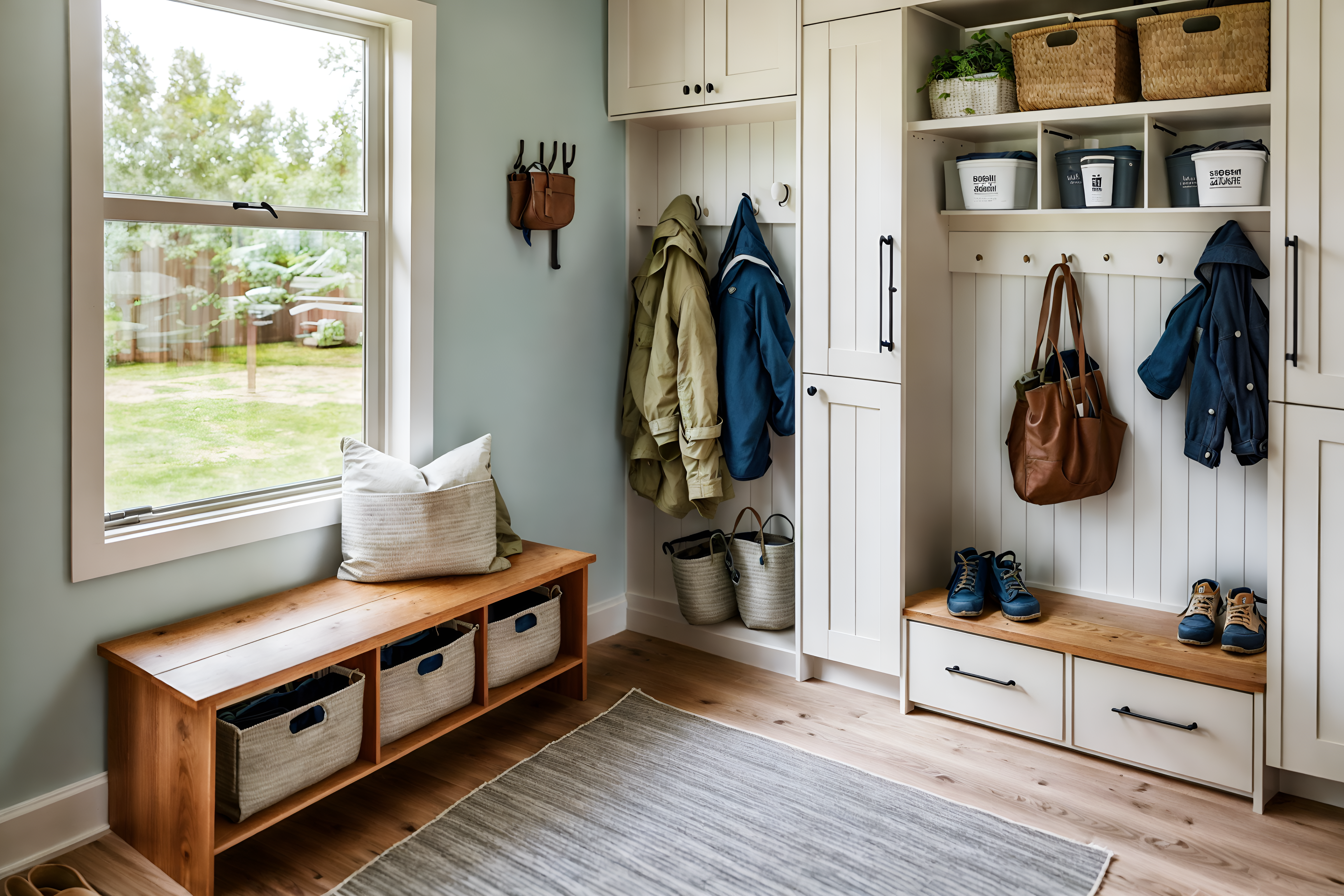 photo from pinterest of airbnb-style interior designed (mudroom interior) with storage baskets and storage drawers and cubbies and wall hooks for coats and shelves for shoes and high up storage and a bench and cabinets. . with open and natural lighting and simple, clean lines and simplistic furniture and scandinavian style and practicality and functionality and neutral walls and textures and simple color palette and natural materials and elements and open and natural lighting. . cinematic photo, highly detailed, cinematic lighting, ultra-detailed, ultrarealistic, photorealism, 8k. trending on pinterest. airbnb interior design style. masterpiece, cinematic light, ultrarealistic+, photorealistic+, 8k, raw photo, realistic, sharp focus on eyes, (symmetrical eyes), (intact eyes), hyperrealistic, highest quality, best quality, , highly detailed, masterpiece, best quality, extremely detailed 8k wallpaper, masterpiece, best quality, ultra-detailed, best shadow, detailed background, detailed face, detailed eyes, high contrast, best illumination, detailed face, dulux, caustic, dynamic angle, detailed glow. dramatic lighting. highly detailed, insanely detailed hair, symmetrical, intricate details, professionally retouched, 8k high definition. strong bokeh. award winning photo.