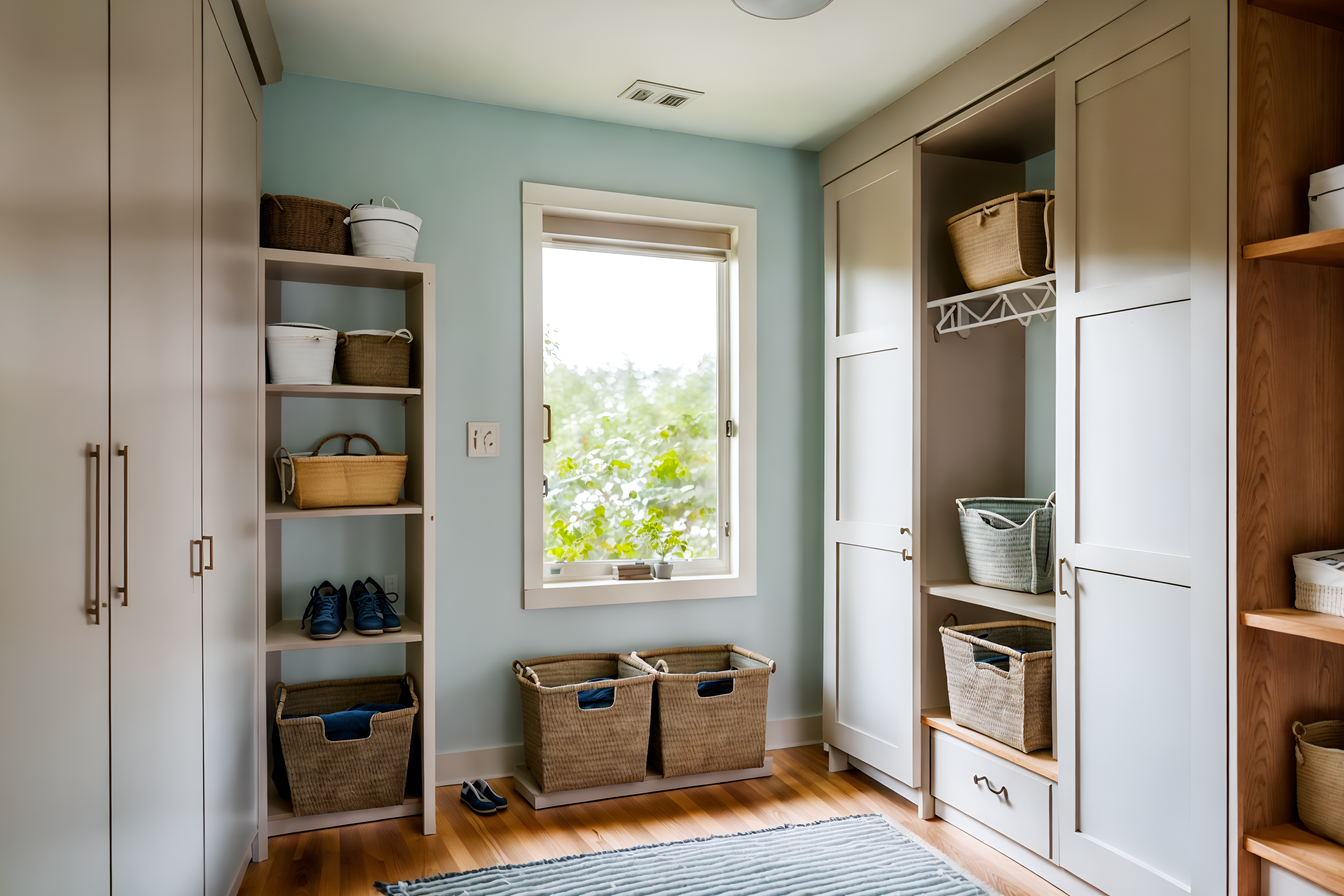 photo from pinterest of airbnb-style interior designed (mudroom interior) with storage baskets and storage drawers and cubbies and wall hooks for coats and shelves for shoes and high up storage and a bench and cabinets. . with open and natural lighting and simple, clean lines and simplistic furniture and scandinavian style and practicality and functionality and neutral walls and textures and simple color palette and natural materials and elements and open and natural lighting. . cinematic photo, highly detailed, cinematic lighting, ultra-detailed, ultrarealistic, photorealism, 8k. trending on pinterest. airbnb interior design style. masterpiece, cinematic light, ultrarealistic+, photorealistic+, 8k, raw photo, realistic, sharp focus on eyes, (symmetrical eyes), (intact eyes), hyperrealistic, highest quality, best quality, , highly detailed, masterpiece, best quality, extremely detailed 8k wallpaper, masterpiece, best quality, ultra-detailed, best shadow, detailed background, detailed face, detailed eyes, high contrast, best illumination, detailed face, dulux, caustic, dynamic angle, detailed glow. dramatic lighting. highly detailed, insanely detailed hair, symmetrical, intricate details, professionally retouched, 8k high definition. strong bokeh. award winning photo.
