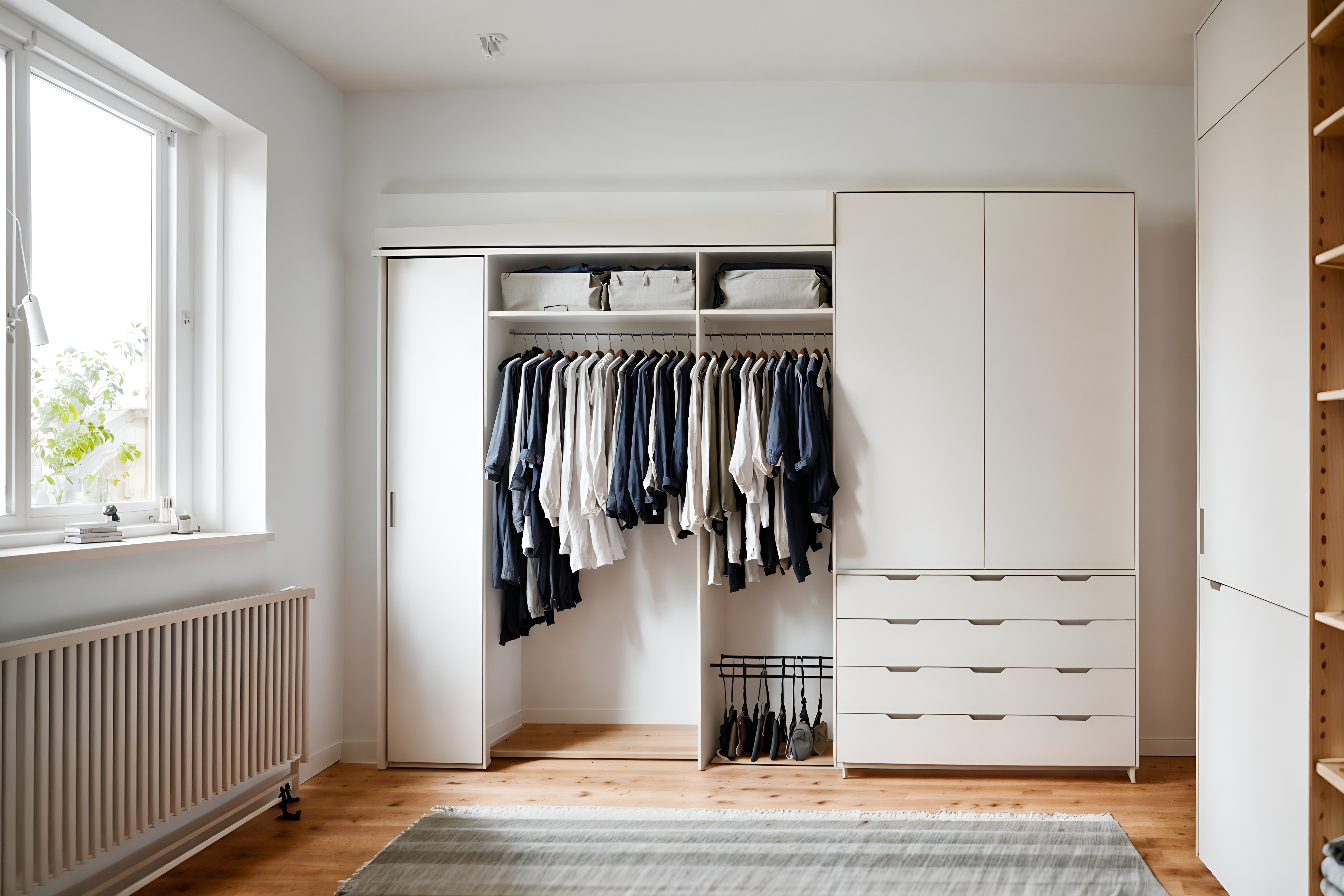 airbnb walk in closetsinterior decorate this walk in closet with airbnb style. . . . with open and natural lighting and practicality and functionality and simple color palette and simple, clean lines and simplistic furniture and scandinavian style and neutral walls and textures and natural materials and elements and open and natural lighting. . .
