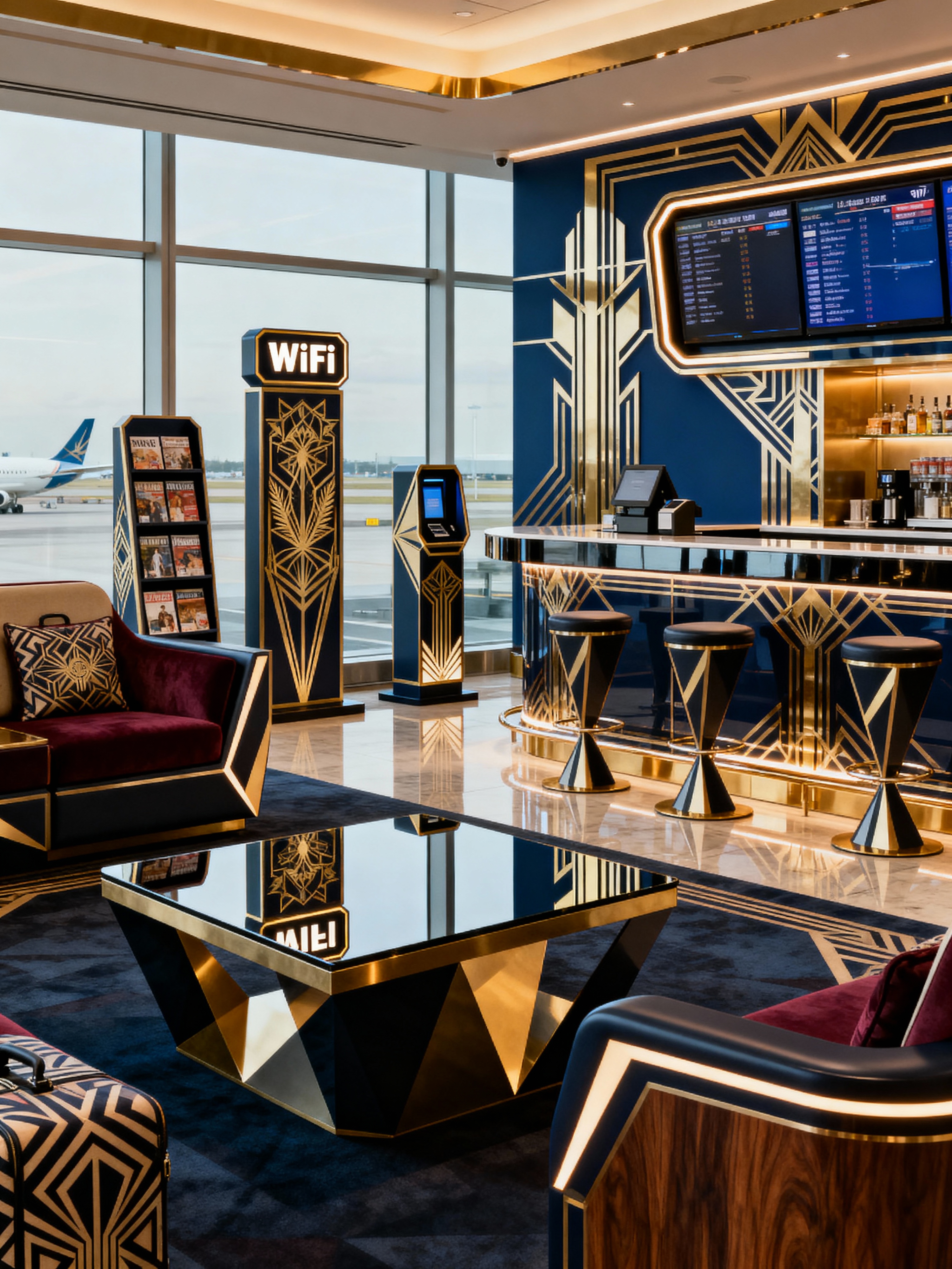 airport lounge with art deco style with luggage storage and coffee tables and flight information displays and magazines and refreshment bar and wifi signs and charging stations and comfortable seating. . with bold geometry and luxury and rich colors and stream-lined forms and glamour and angular shapes and smooth lines and abstract patterns
