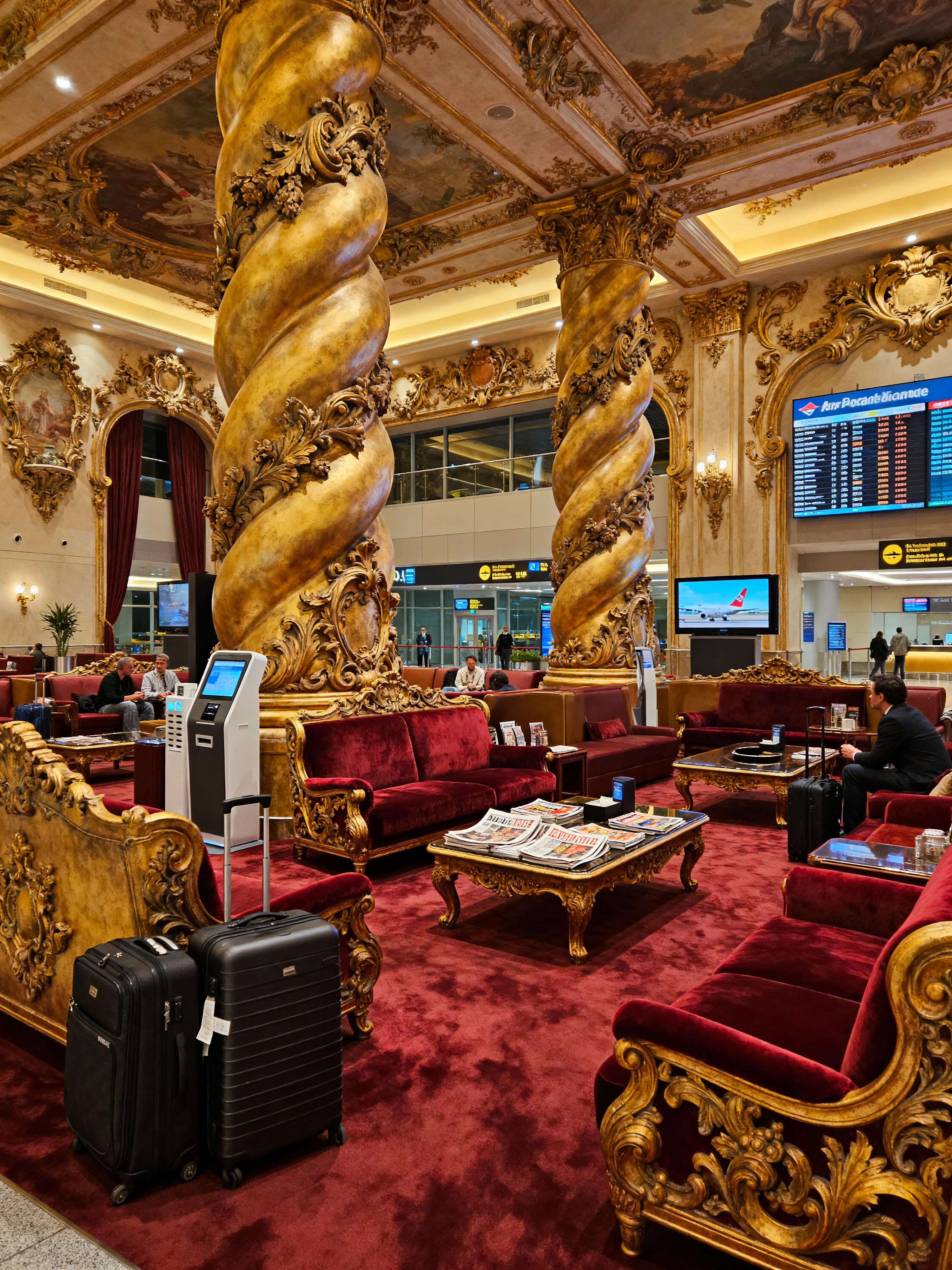 airport lounge with baroque style with magazines and television screens and flight information displays and newspapers and coffee tables and luggage storage and comfortable seating and charging stations. . with grandeur and movement and twisted columns and opulent and colossal furniture and tension and expensive and plush flooring and elaborate ornamentation and intricate carvings and ornaments
