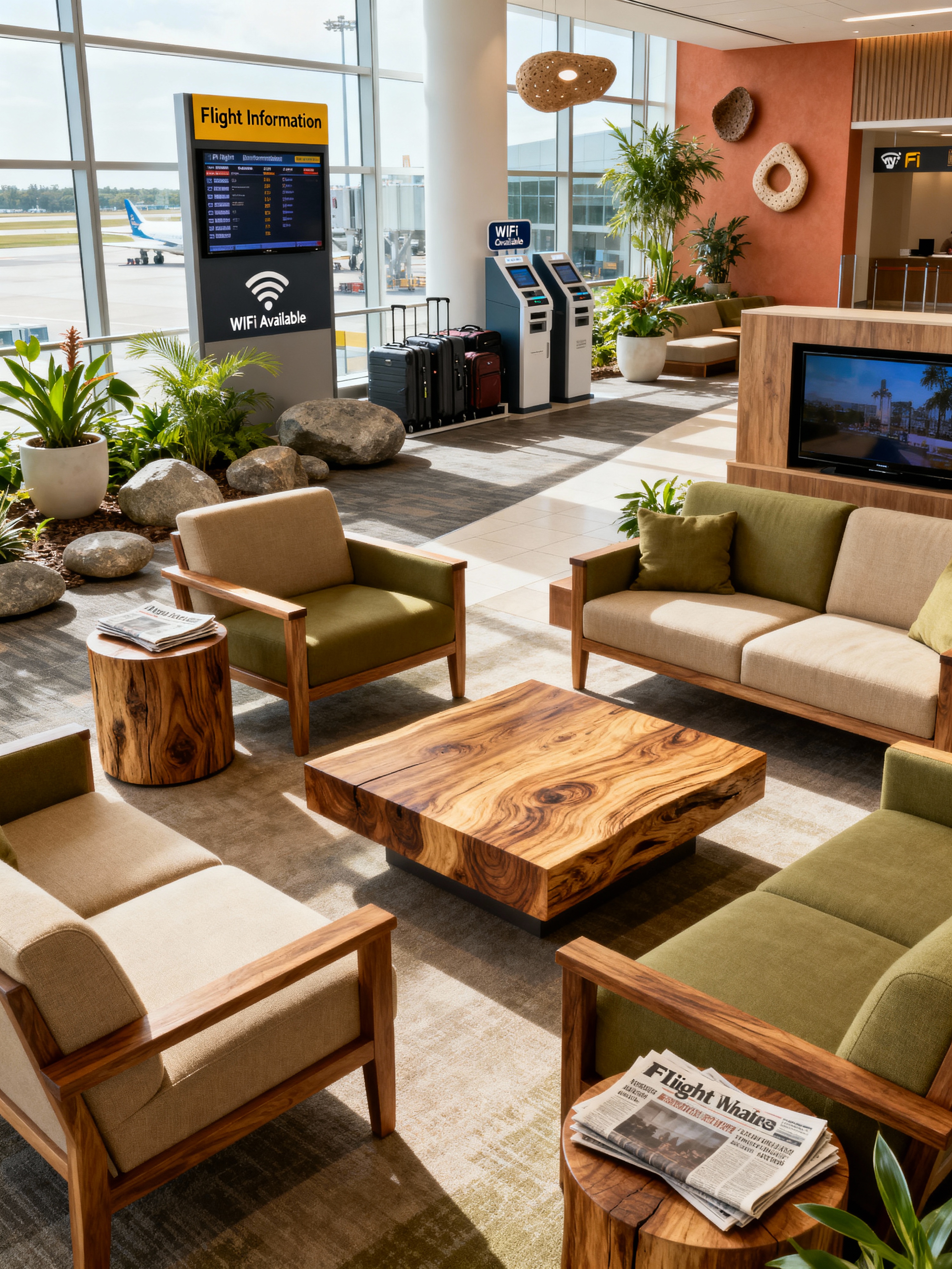 airport lounge with biophilic style with television screens and newspapers and comfortable seating and flight information displays and wifi signs and charging stations and luggage storage and coffee tables. . with natural shapes and forms and sunlight and fresh air and earthy colors and features of the natural world and natural environment and wood materials and features of nature