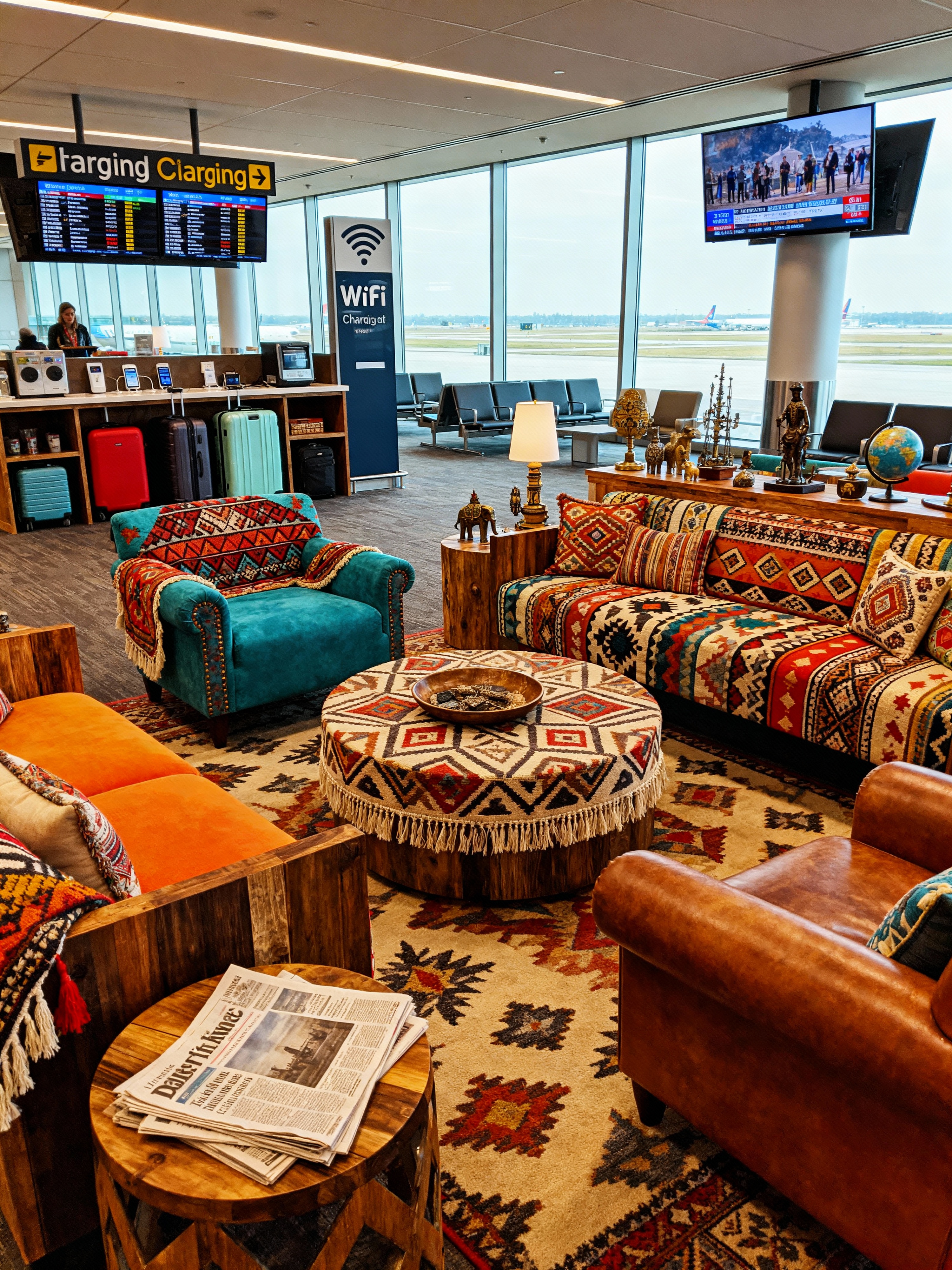 airport lounge with bohemian style with charging stations and comfortable seating and television screens and coffee tables and luggage storage and flight information displays and wifi signs and newspapers. . with bold patterns and woods and playful patterns and carefree layers of pattern, texture, and color and travel trinkets and bold colors and mixed patterns and playful colors