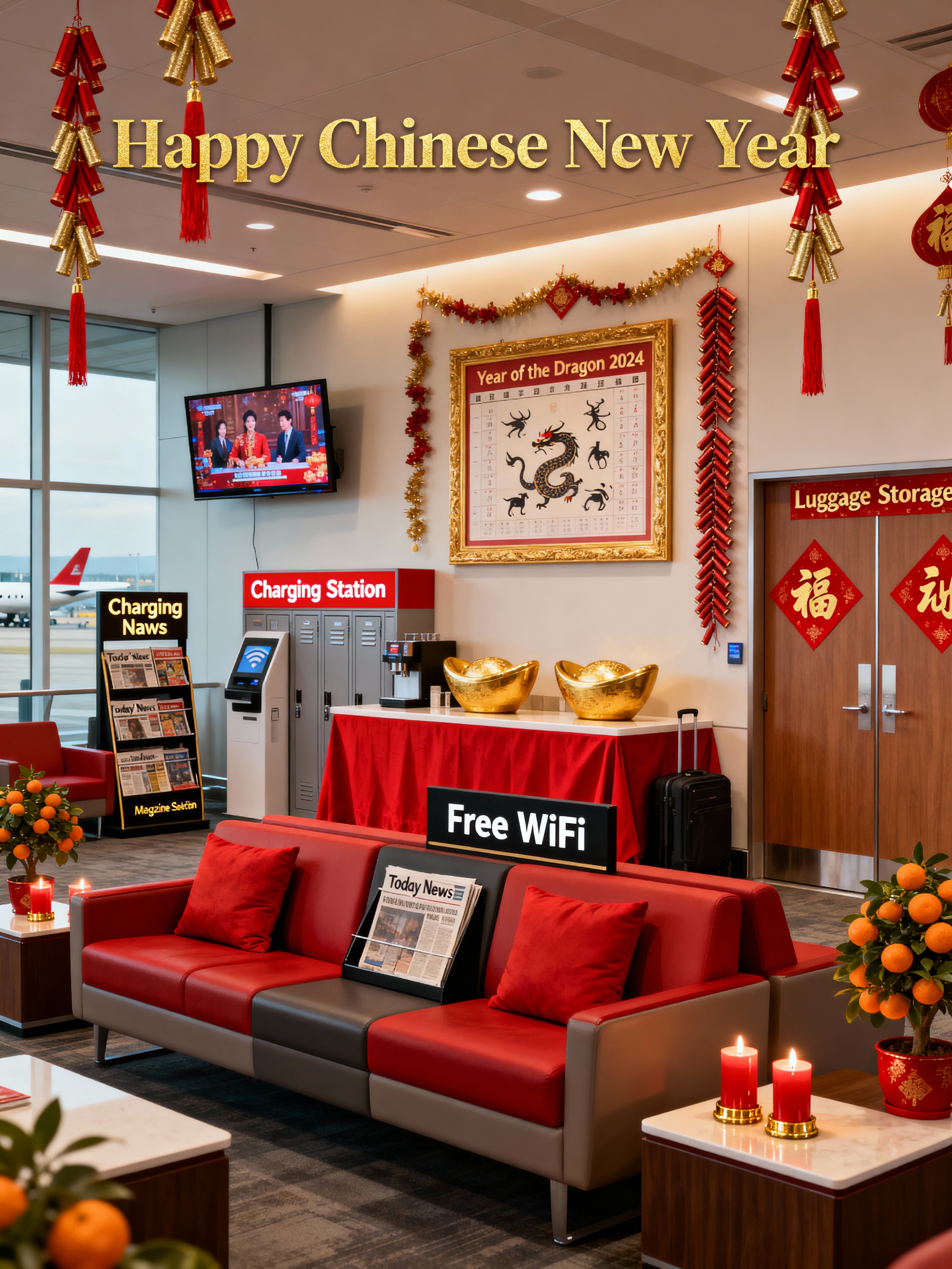 airport lounge with chinese new year style with comfortable seating and wifi signs and refreshment bar and charging stations and newspapers and magazines and luggage storage and television screens. . with red and gold tassels and zodiac calendar and gold ingots and paper firecrackers and red and gold candles and orange trees and door couplets and kumquat trees