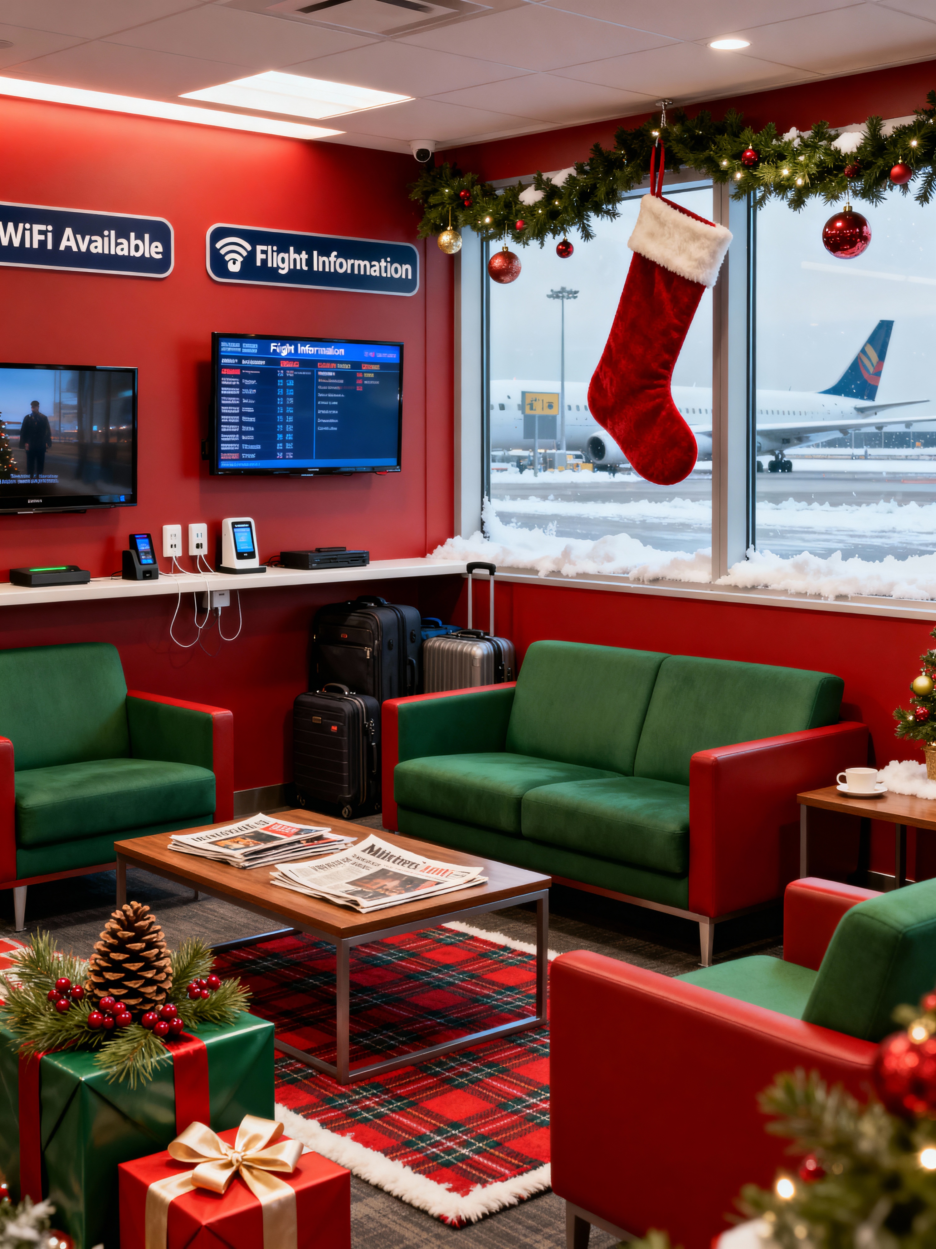 airport lounge with christmas style with coffee tables and newspapers and charging stations and magazines and luggage storage and television screens and wifi signs and flight information displays. . with tie pinecones and berries and plaid rugs and a few big socks hanging and christmas ornaments and berries and greenery draped and snow outside and giftwrapped gifts and ribbons