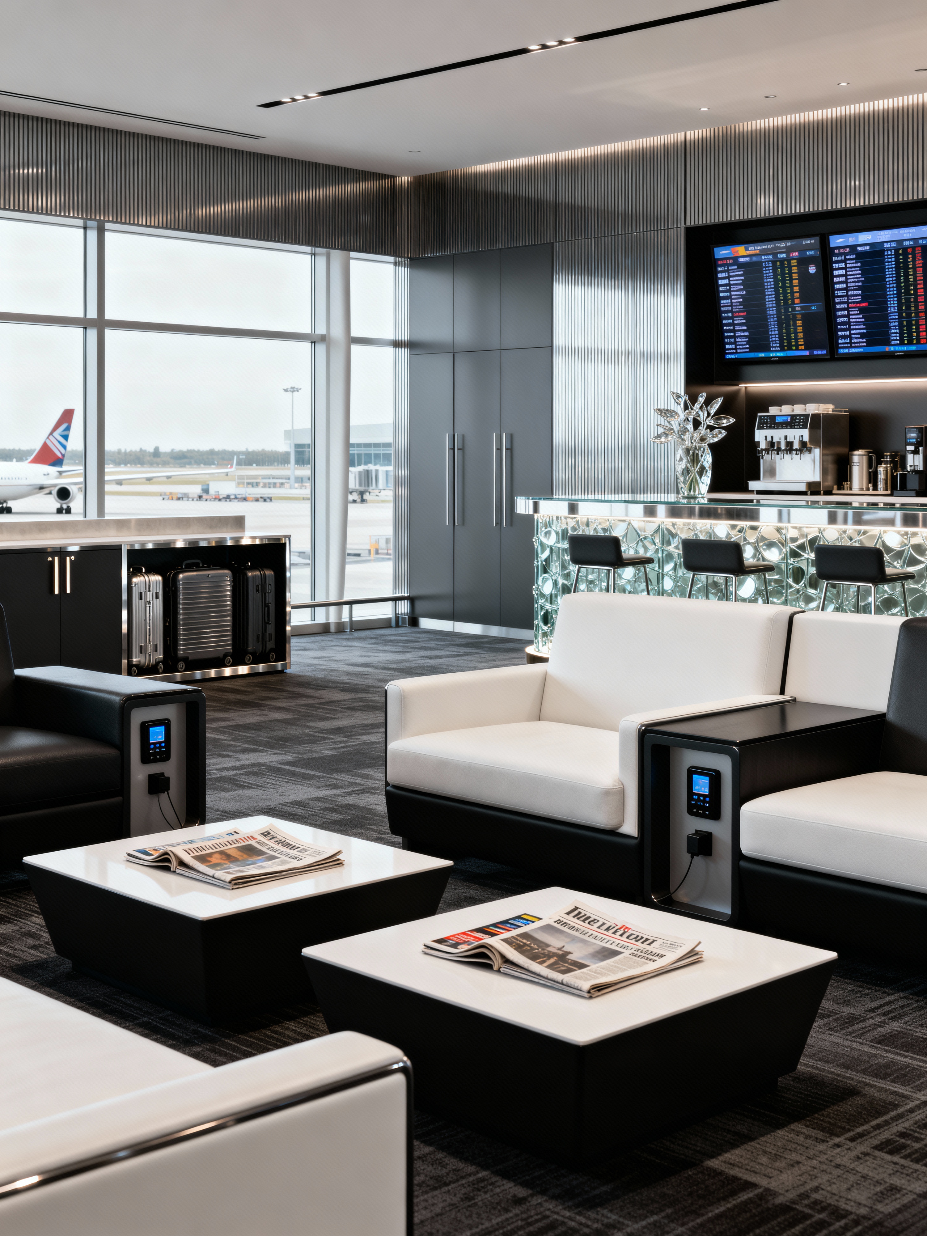 airport lounge with contemporary style with newspapers and charging stations and magazines and luggage storage and coffee tables and refreshment bar and comfortable seating and flight information displays. . with functional design and high contrast and minimalist and sleek lines and elegant simplicity and metal accents and glass decor and modern finishes
