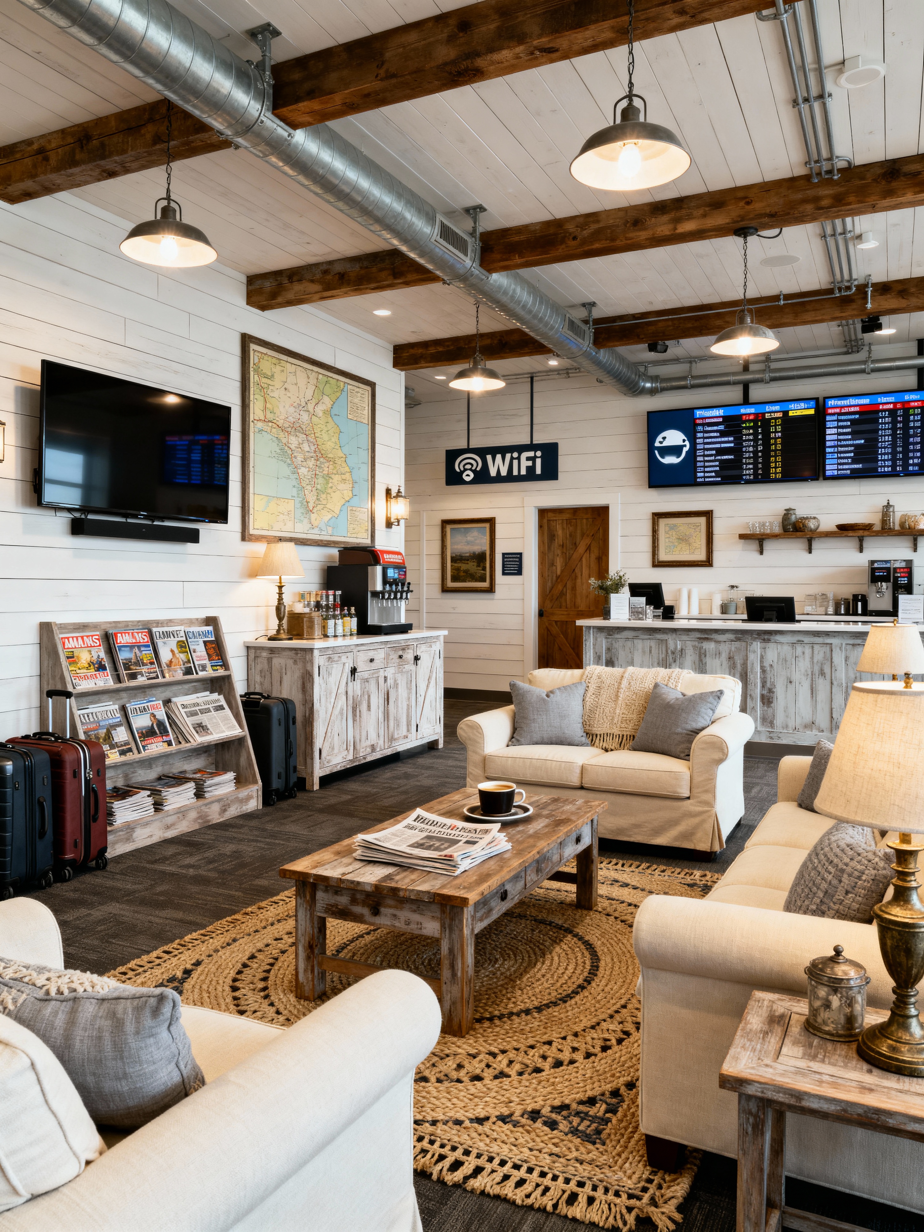 airport lounge with farmhouse style with television screens and magazines and refreshment bar and newspapers and coffee tables and flight information displays and wifi signs and luggage storage. . with shiplap walls and exposed wood and industrial accents and country style and natural textures and neutral tones and vintage decor and rustic charm