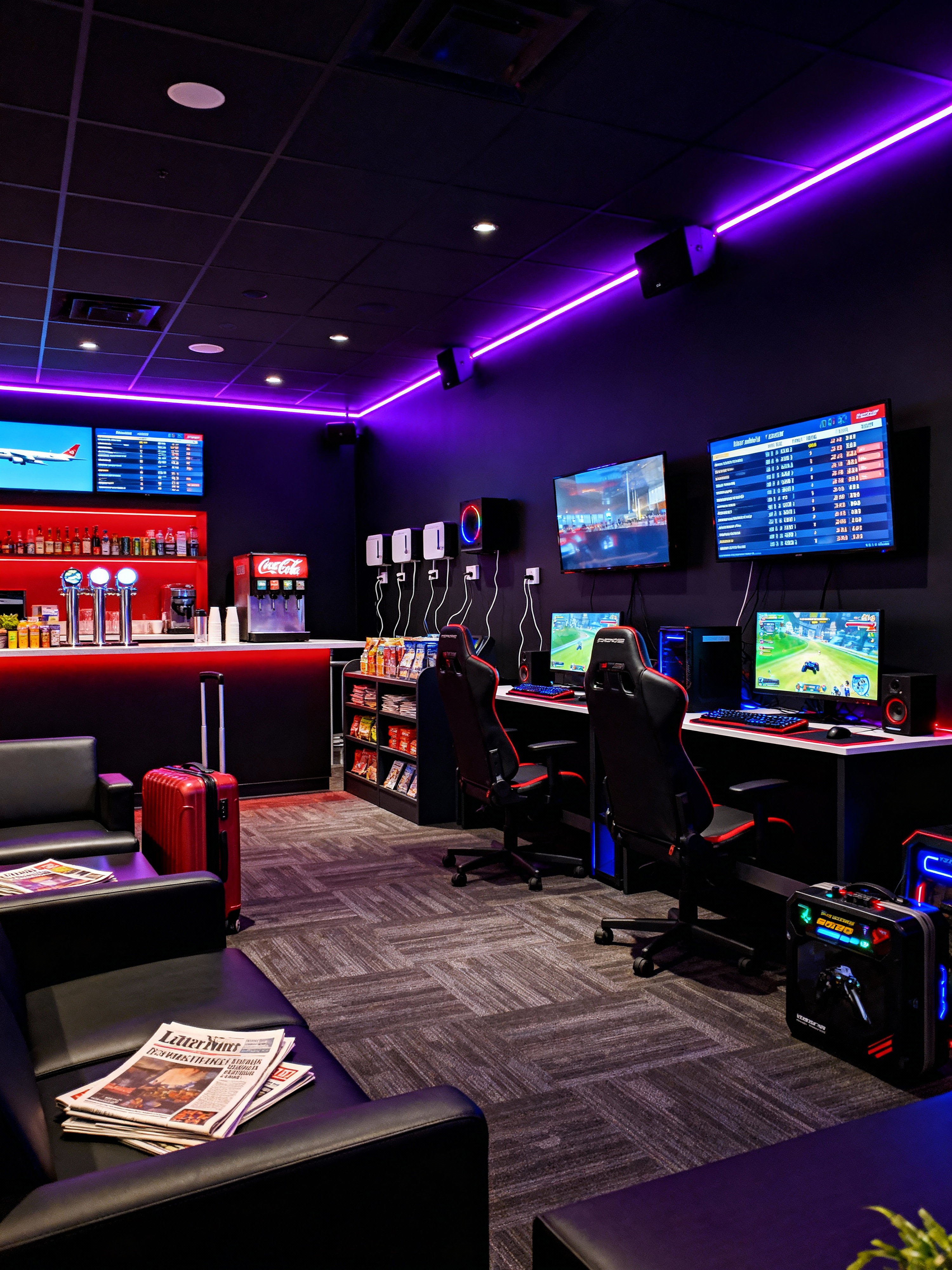 airport lounge with gaming room style with charging stations and refreshment bar and comfortable seating and luggage storage and newspapers and magazines and television screens and flight information displays. . with neon lights and at night and computer desk with computer displays and keyboard and dark walls and dark lit room and multiple displays and video game consoles and purple and red lights