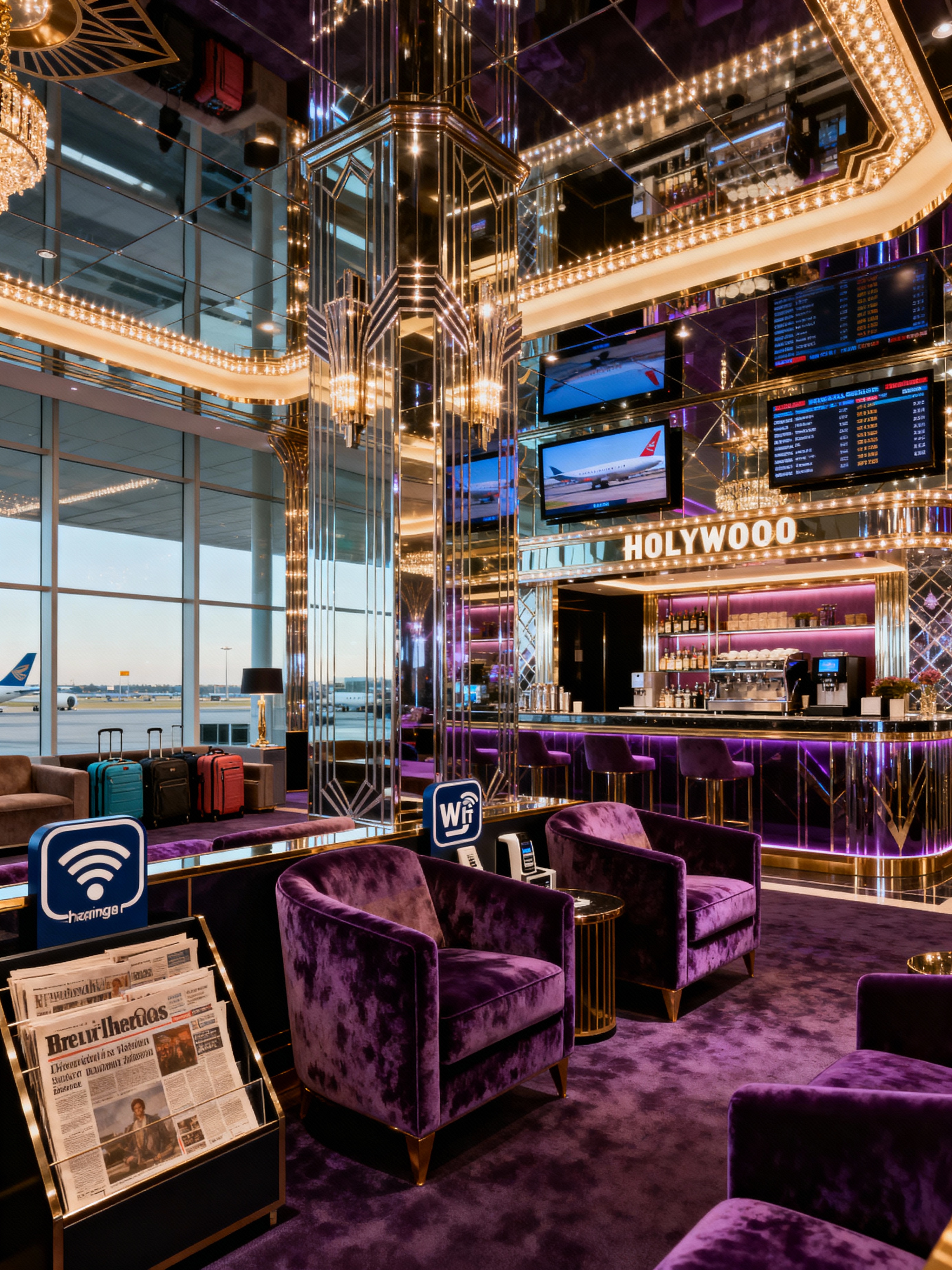 airport lounge with hollywood glam style with comfortable seating and wifi signs and television screens and luggage storage and charging stations and newspapers and flight information displays and refreshment bar. . with velvet upholstery and dramatic lighting and art deco influence and mirrored surfaces and metallic accents and bold colors and luxurious fabrics and opulent details