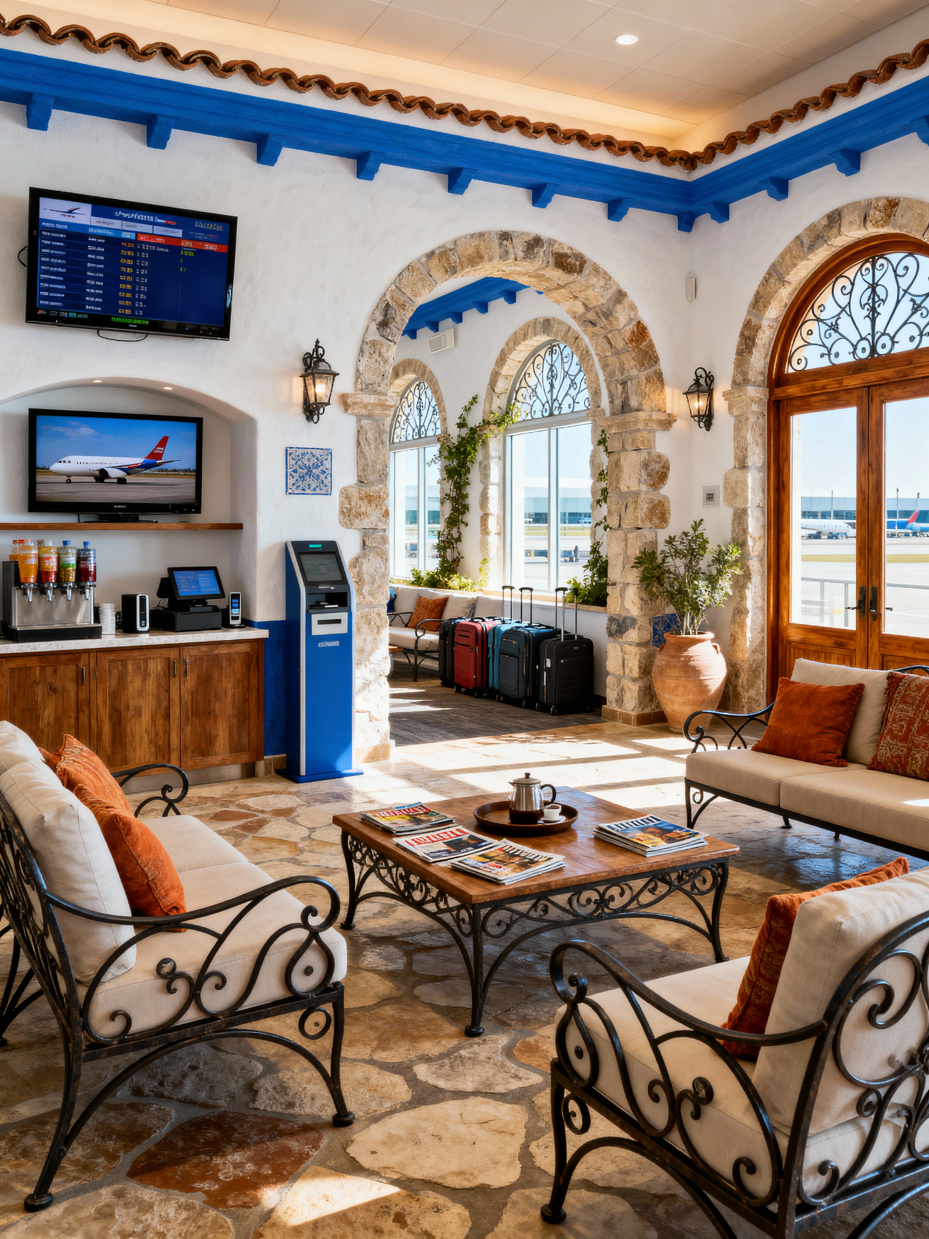 airport lounge with mediterranean style with television screens and flight information displays and luggage storage and charging stations and coffee tables and refreshment bar and magazines and comfortable seating. . with wrought iron and rustic charm and stone accents and outdoor living and arched doorways and blue and white and sun-drenched and warm earth tones