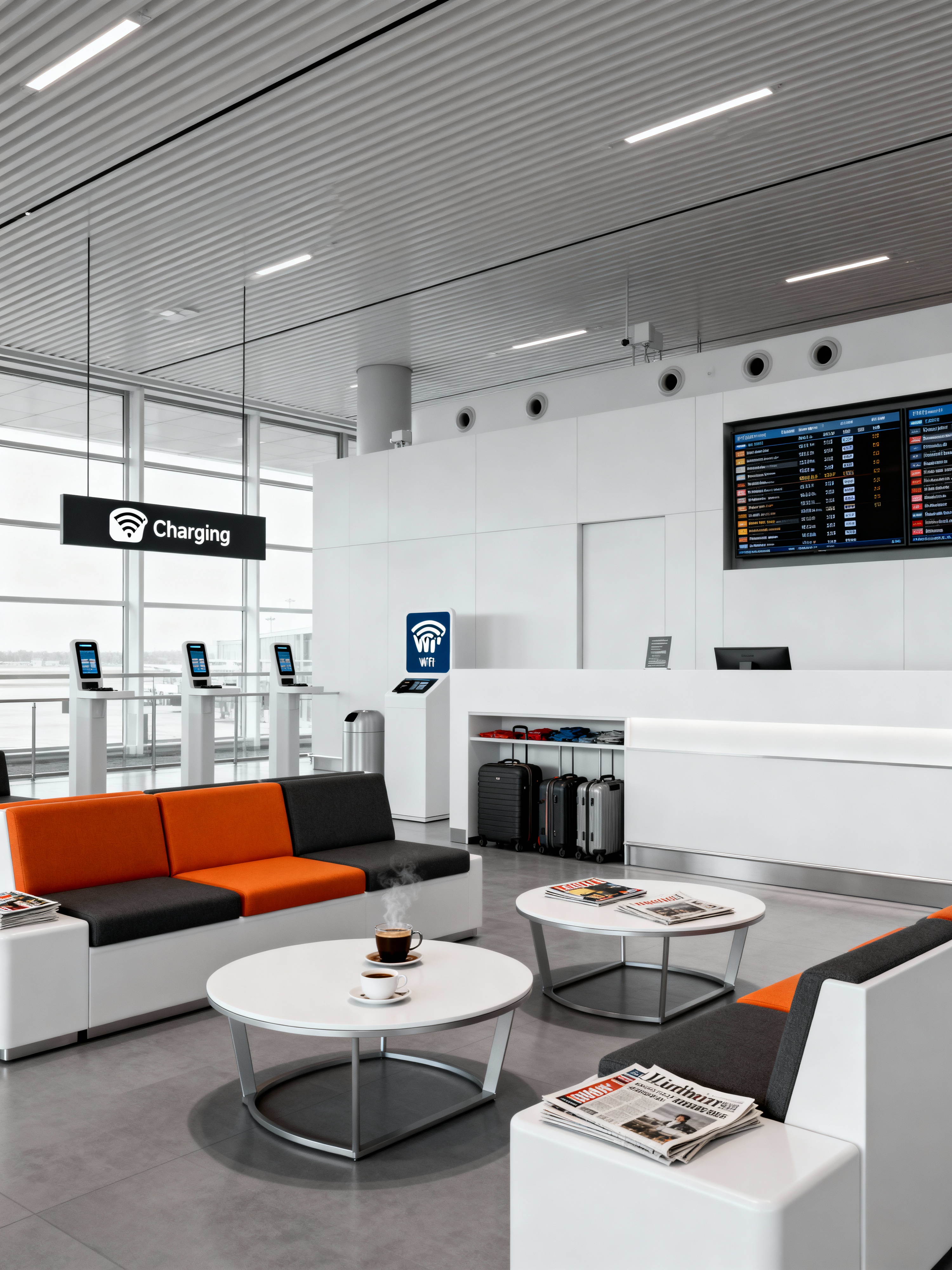 airport lounge with minimalist style with charging stations and coffee tables and wifi signs and magazines and flight information displays and luggage storage and comfortable seating and newspapers. . with a monochromatic palette with colour used as an accent and clean lines and functional furniture and an open floor plan and focus on the shape, colour and texture of just a few of essential elements and lots of light and a monochromatic palette with colour used as an accent