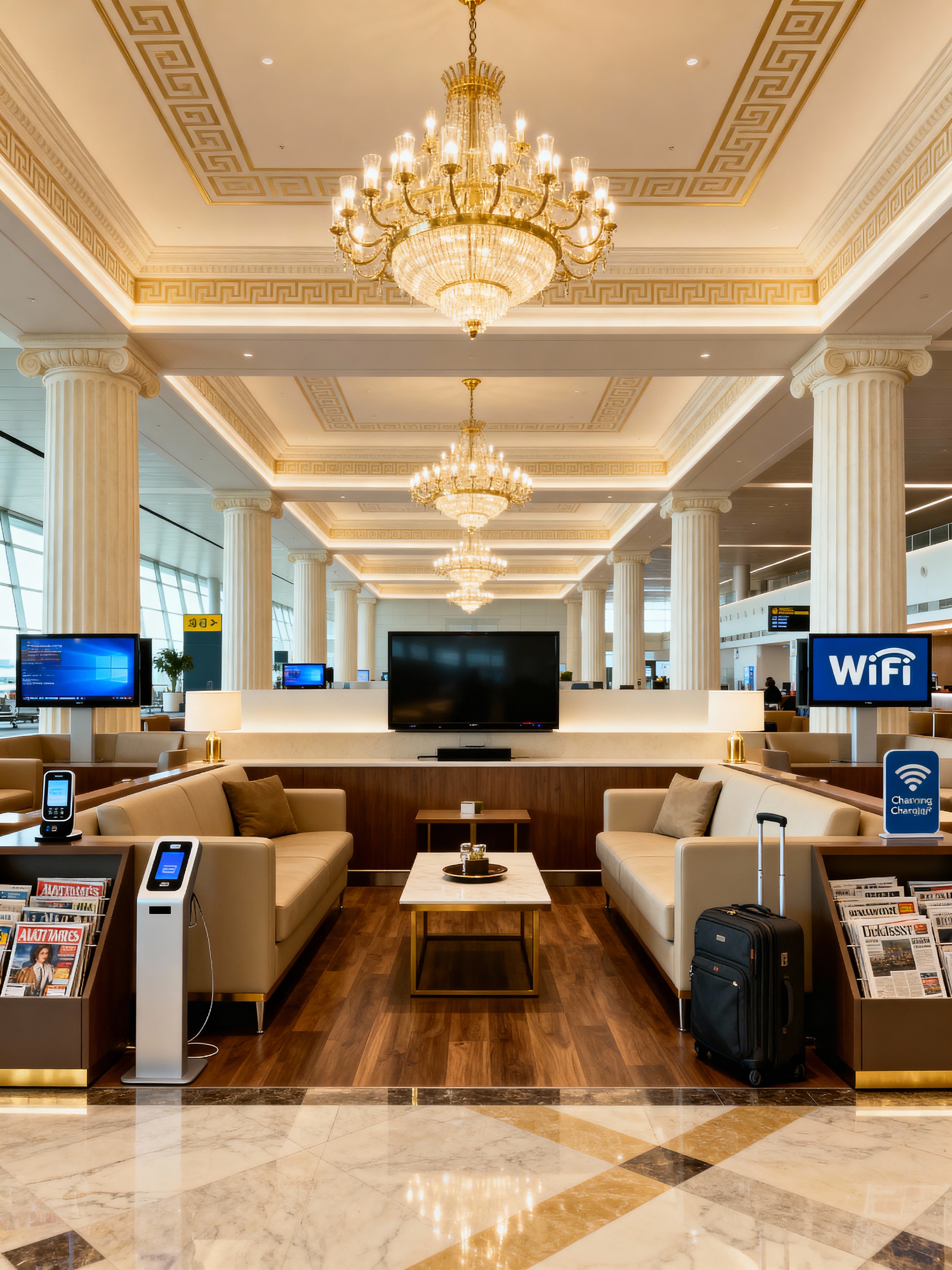 airport lounge with neoclassic style with television screens and coffee tables and charging stations and wifi signs and comfortable seating and luggage storage and magazines and newspapers. . with timeless furniture and symmetric layouts and high ceilings and geometric decorative elements and elegant and sophisticated and classical architectural details and emphasized horizontal and vertical lines and greek columns
