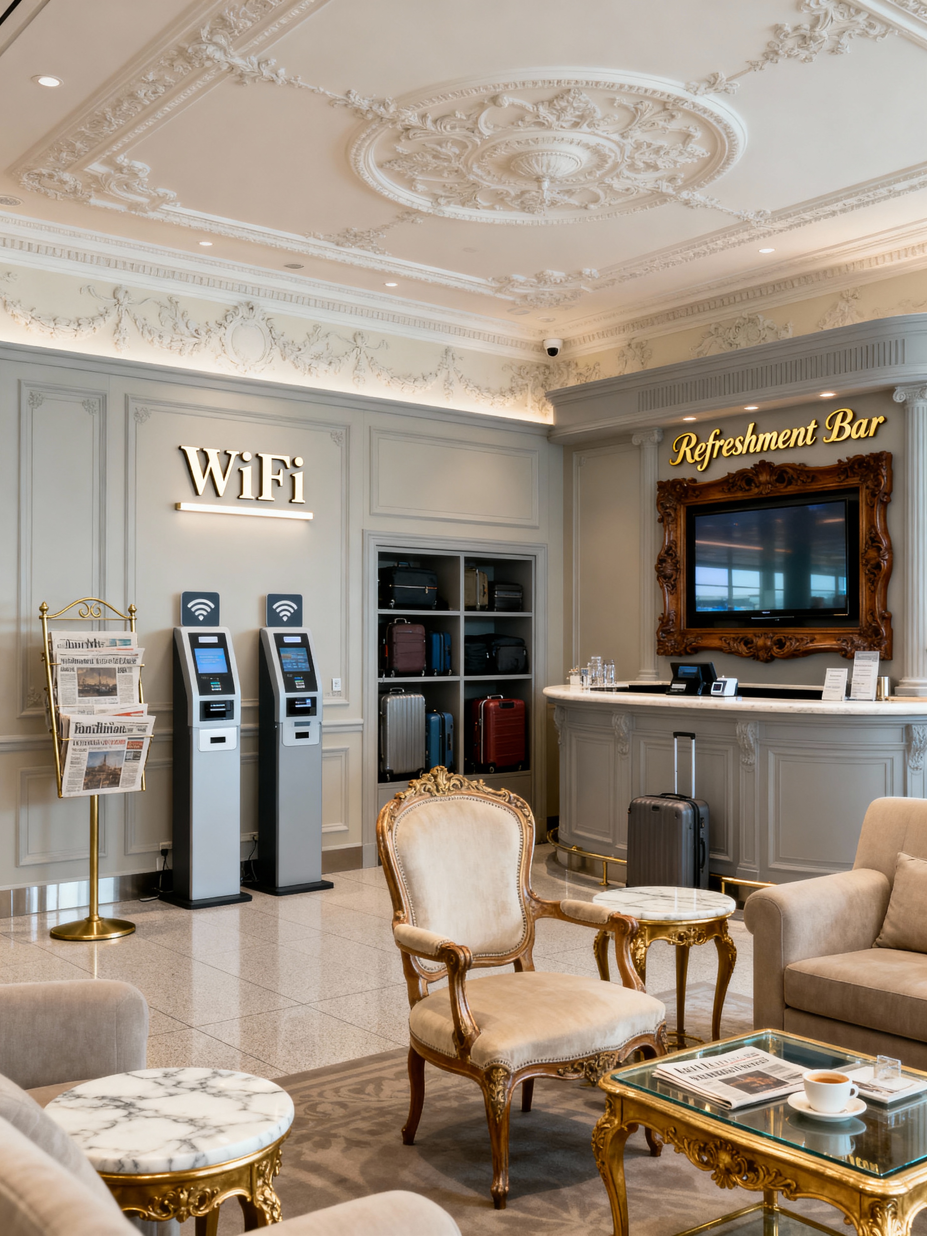 airport lounge with parisian style with refreshment bar and comfortable seating and wifi signs and television screens and luggage storage and charging stations and coffee tables and newspapers. . with classic details and french elegance and sophisticated charm and neutral palette and european flair and ornate moldings and antique furniture and chic simplicity