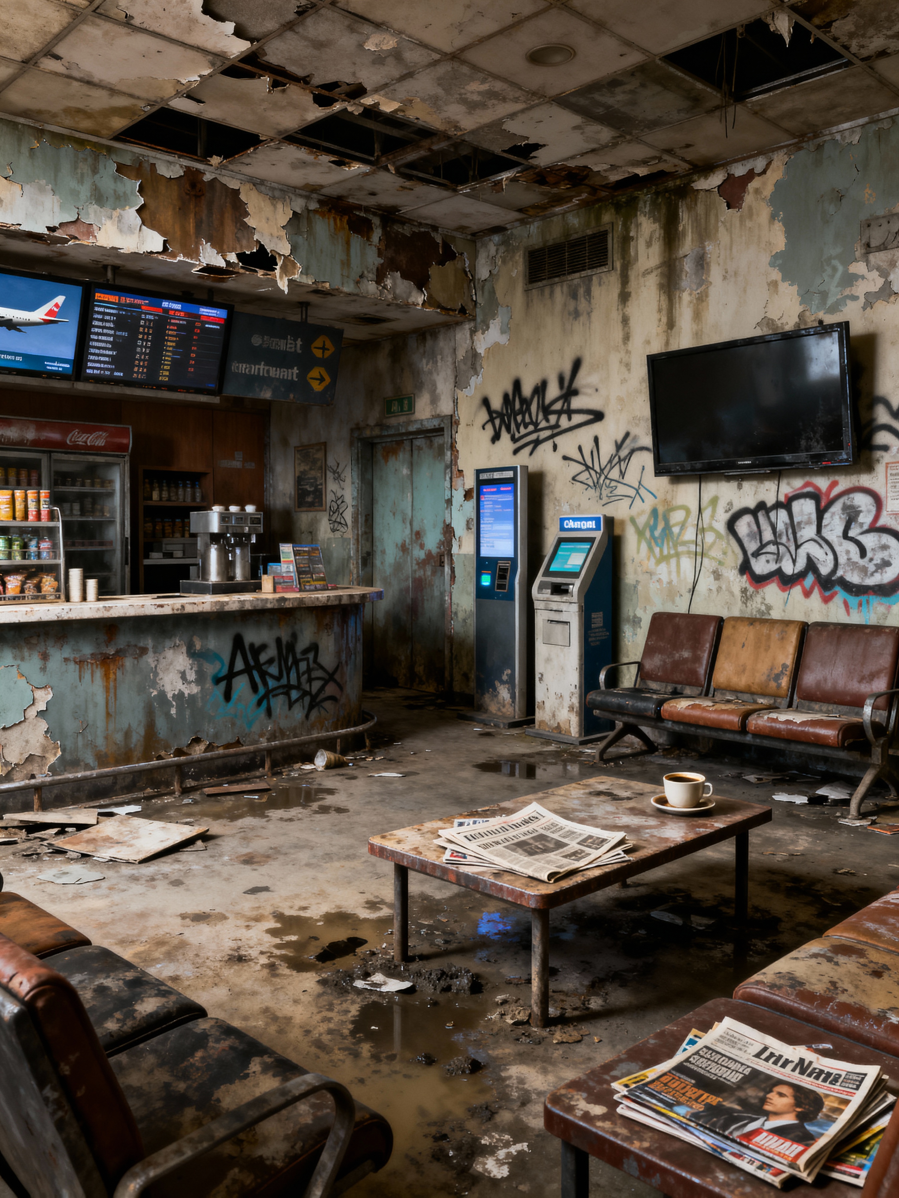 airport lounge with post-apocalyptic style with refreshment bar and newspapers and coffee tables and television screens and magazines and charging stations and comfortable seating and flight information displays. . with peeling paint and graffiti on walls and industrial elements and distressed furniture and scavenged decor and dirty floor and desolate and post-apocalyptic
