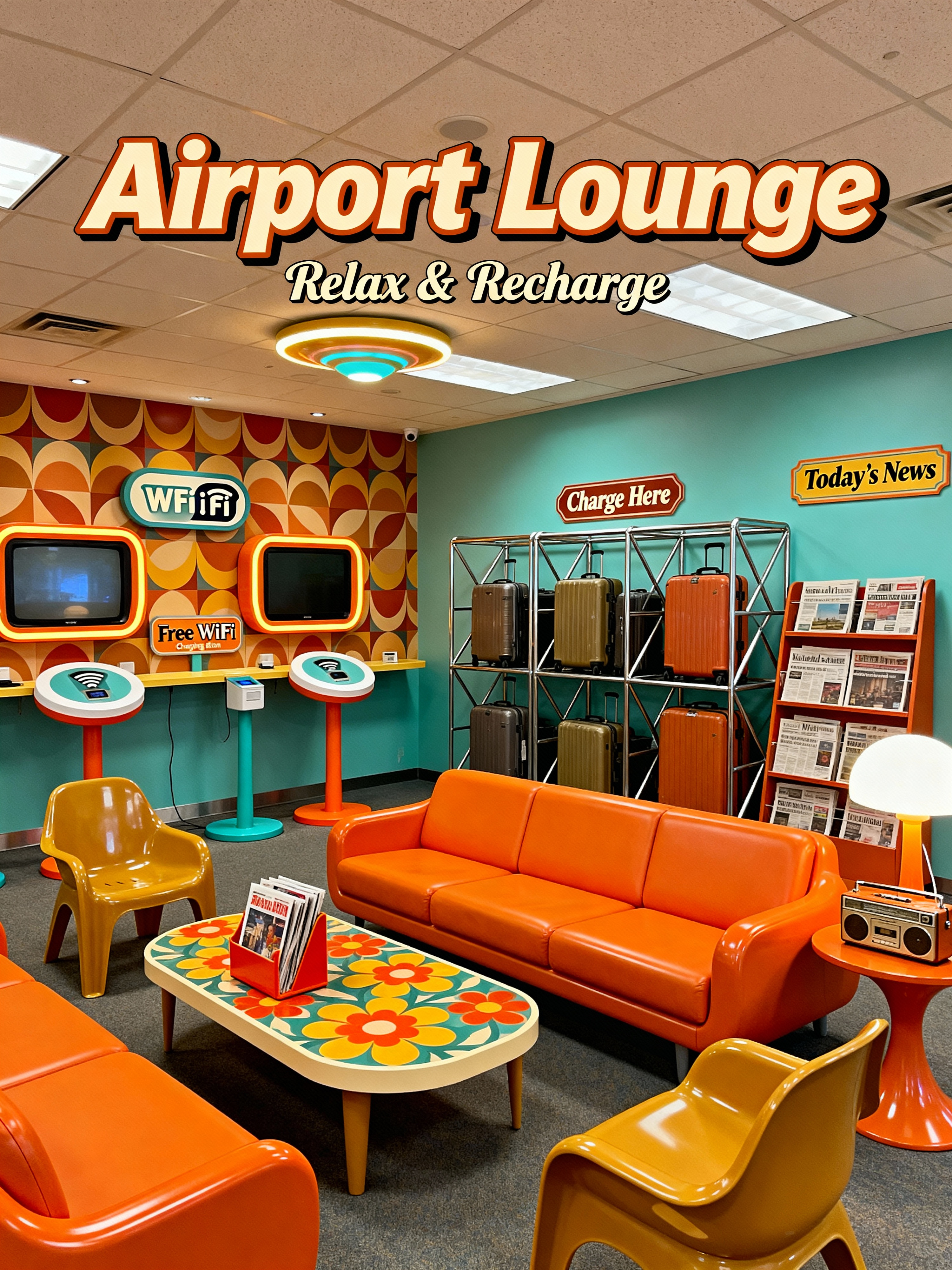 airport lounge with retro style with charging stations and wifi signs and television screens and comfortable seating and luggage storage and coffee tables and newspapers and magazines. . with bright colors and nostalgic pieces and bold patterns and plastic furniture and groovy vibes and geometric shapes and vintage revival and space age