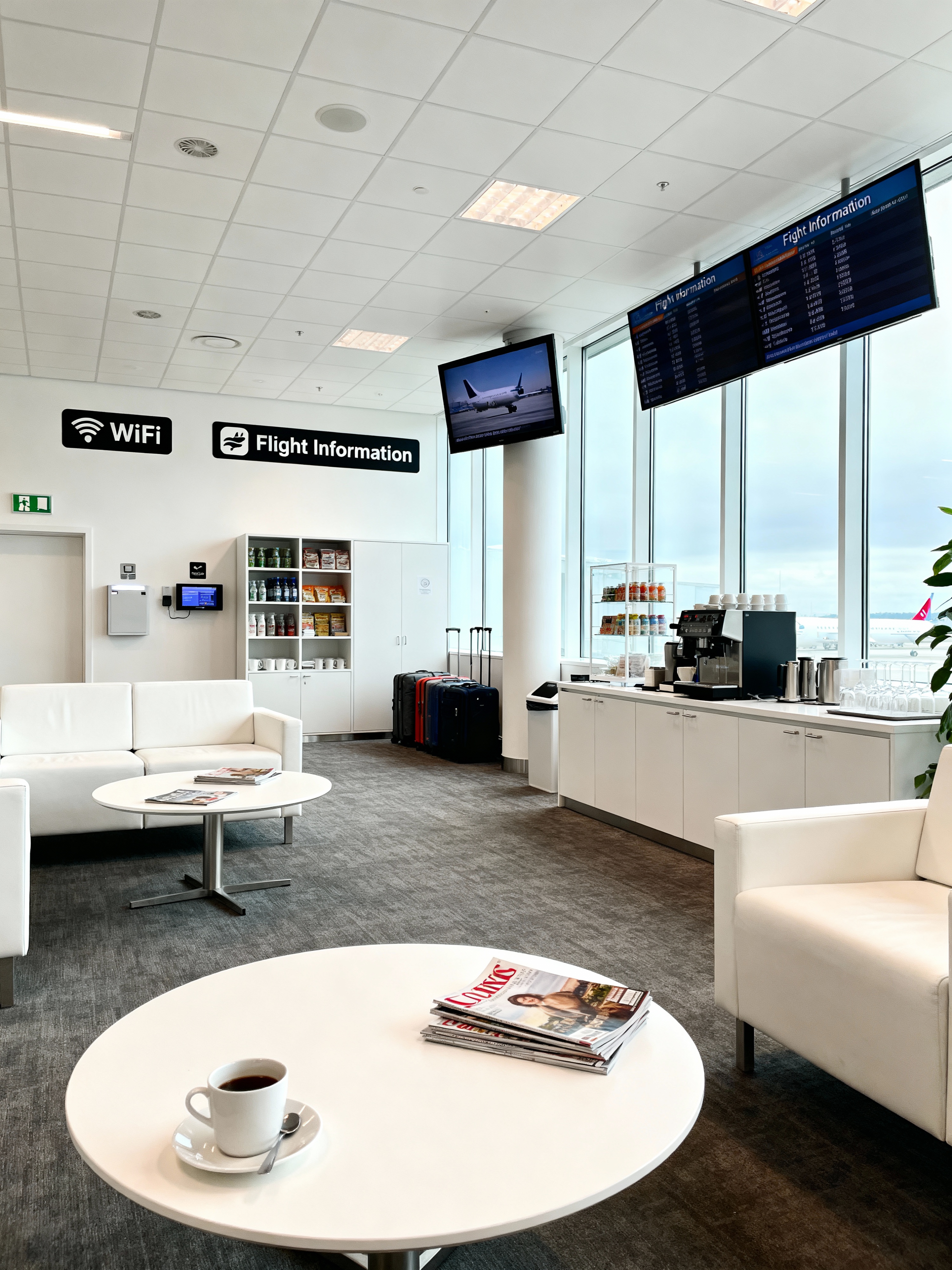 airport lounge with scandinavian style with coffee tables and refreshment bar and magazines and charging stations and television screens and luggage storage and wifi signs and flight information displays. . with clean lines and natural light and minimalist design and cozy atmosphere and simple elegance and white decor and functional furniture and neutral palette