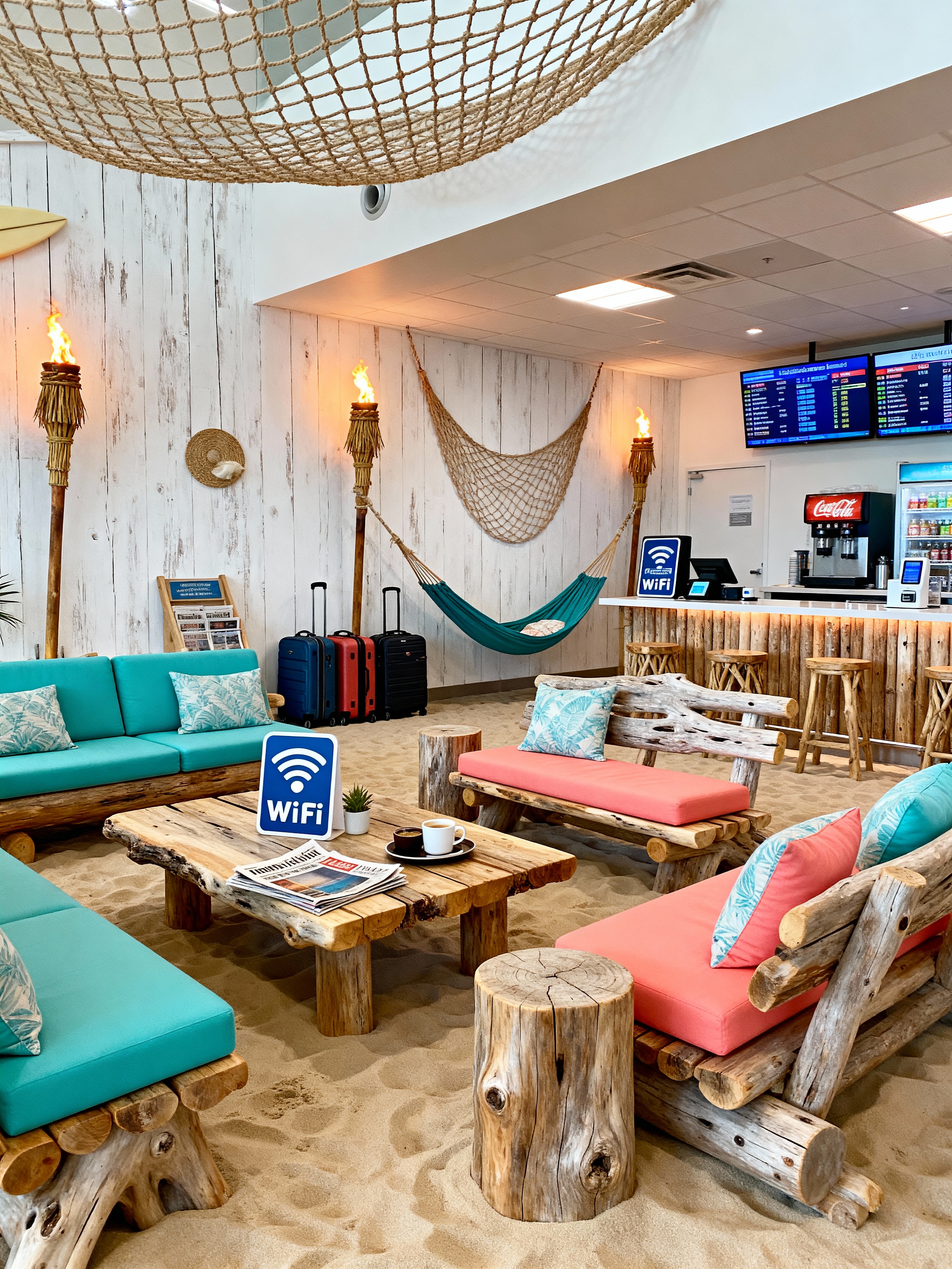 airport lounge with surf shack style with coffee tables and wifi signs and newspapers and luggage storage and flight information displays and refreshment bar and charging stations and magazines. . with driftwood furniture and tiki torches and beach vibes and ocean-inspired colors and white-washed walls and net decorations and hammocks and coastal lighting