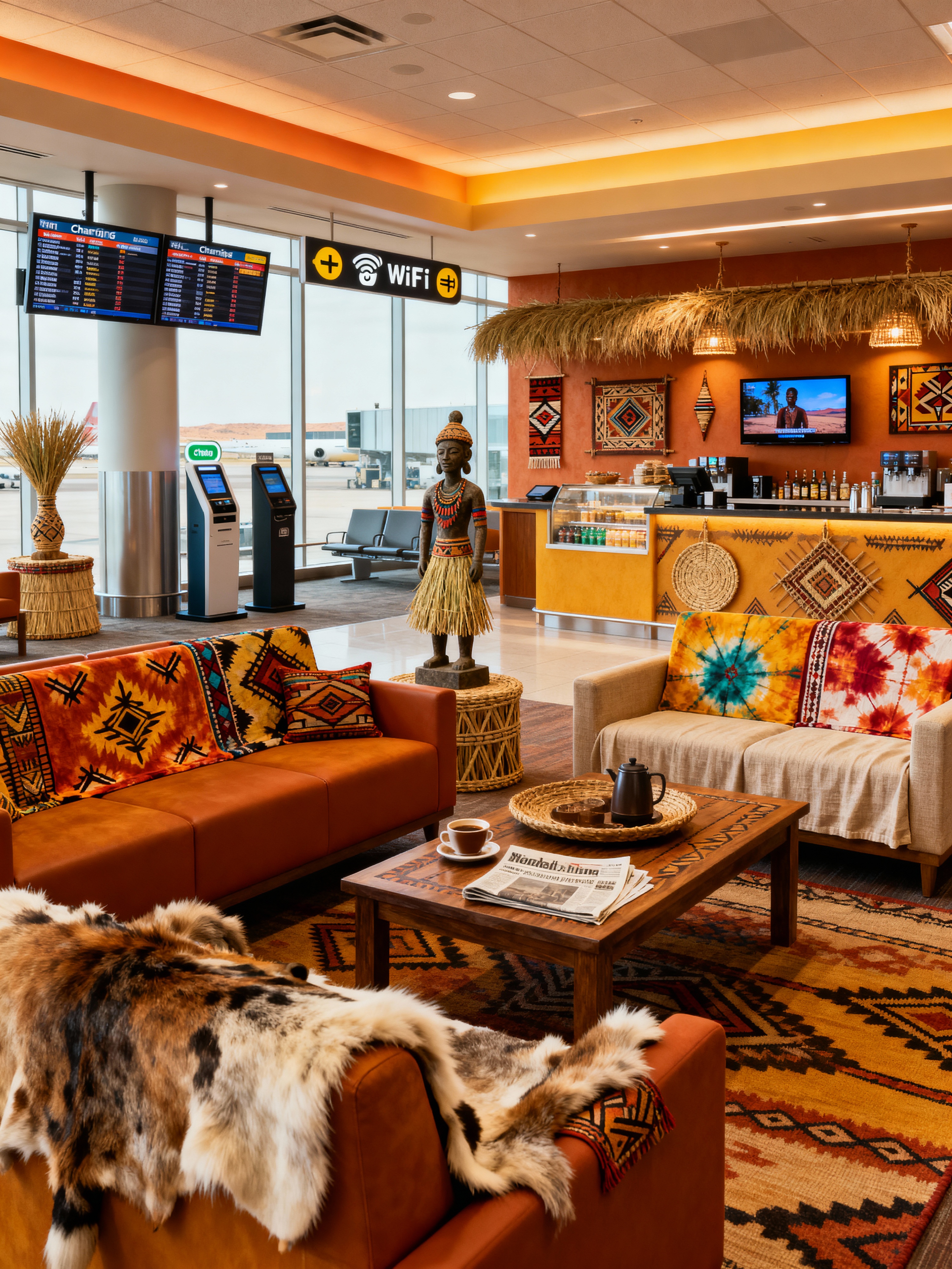 airport lounge with tribal style with charging stations and wifi signs and coffee tables and flight information displays and newspapers and television screens and comfortable seating and refreshment bar. . with sculptures and artworks and intricate grass weaving and tribal patterns and exuberant splashes of colour and hand dyed batik fabrics and tribal revival and desert colours and animal furslinen