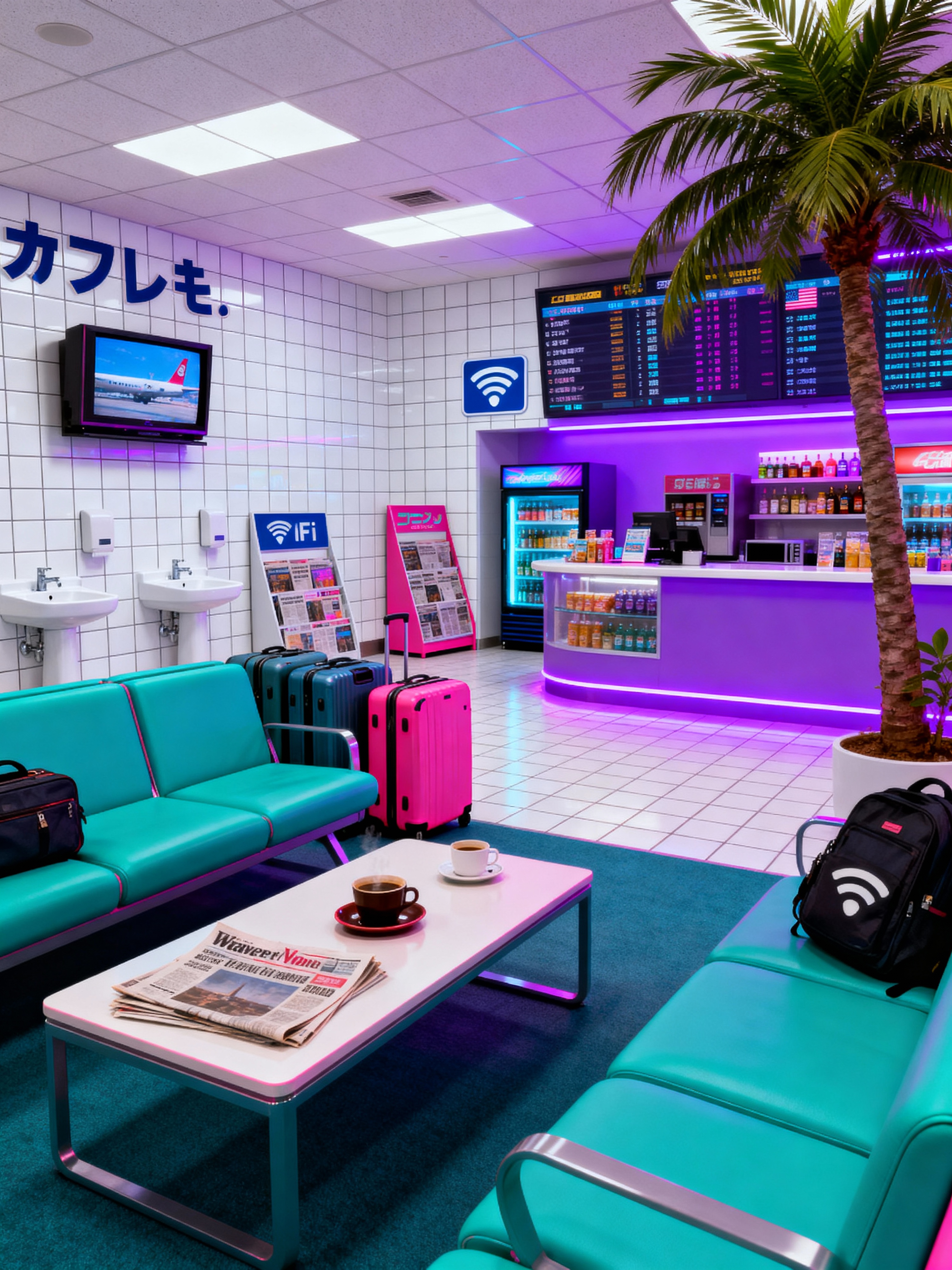 airport lounge with vaporwave style with newspapers and wifi signs and coffee tables and luggage storage and refreshment bar and television screens and comfortable seating and flight information displays. . with white square bathroom tiles and teal colors and palm trees and washed out colors and japanese letters on wall and bright pink and white square bathroom tiles and purple lights