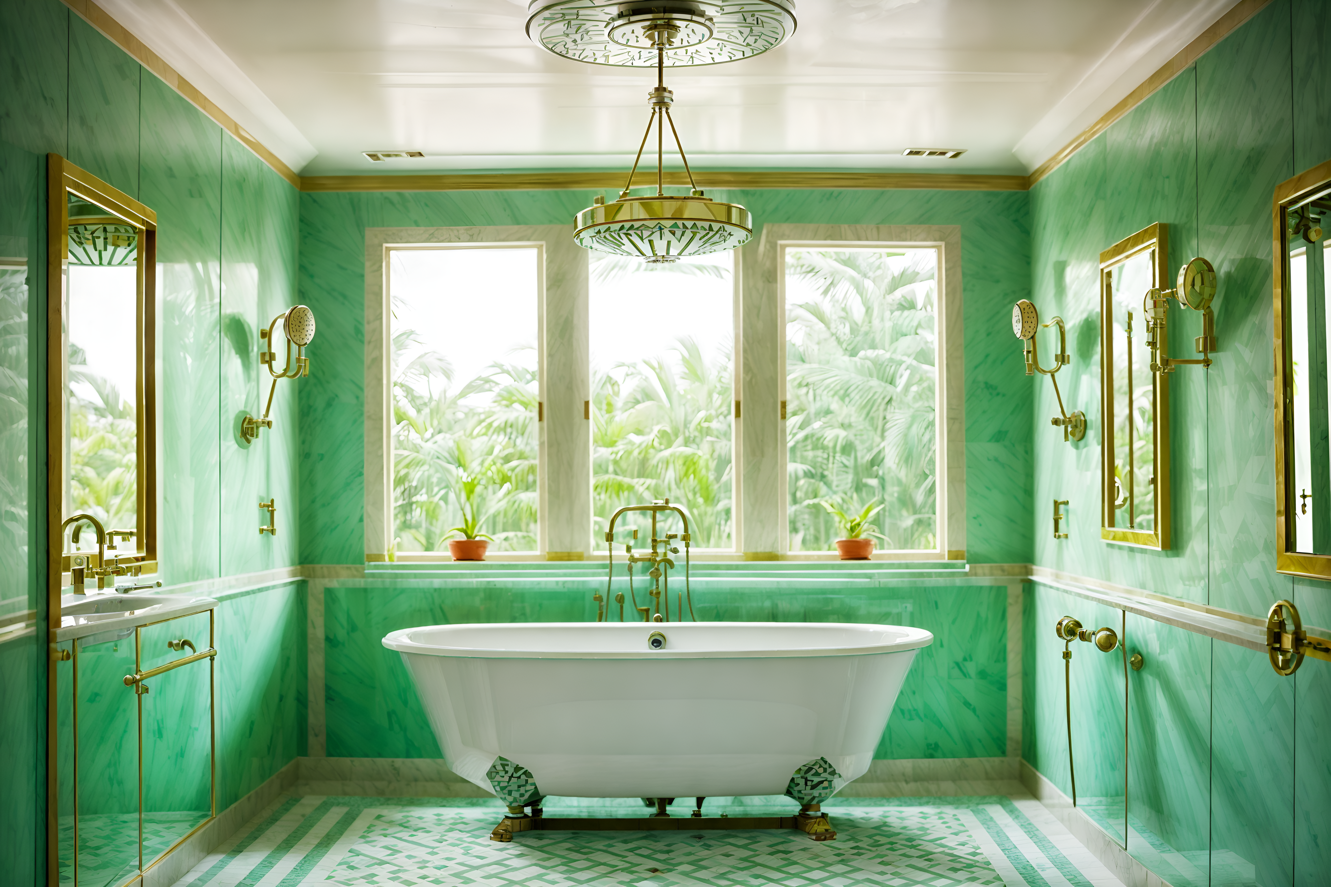 photo from pinterest of art deco-style interior designed (bathroom interior) with shower and waste basket and plant and mirror and bathtub and bathroom sink with faucet and bath rail and bathroom cabinet. . with symmetrical designs and angular shapes and bright and cheerful colors and glamour and geometric shapes and bold geometry and exuberant shapes and smooth lines. . cinematic photo, highly detailed, cinematic lighting, ultra-detailed, ultrarealistic, photorealism, 8k. trending on pinterest. art deco interior design style. masterpiece, cinematic light, ultrarealistic+, photorealistic+, 8k, raw photo, realistic, sharp focus on eyes, (symmetrical eyes), (intact eyes), hyperrealistic, highest quality, best quality, , highly detailed, masterpiece, best quality, extremely detailed 8k wallpaper, masterpiece, best quality, ultra-detailed, best shadow, detailed background, detailed face, detailed eyes, high contrast, best illumination, detailed face, dulux, caustic, dynamic angle, detailed glow. dramatic lighting. highly detailed, insanely detailed hair, symmetrical, intricate details, professionally retouched, 8k high definition. strong bokeh. award winning photo.