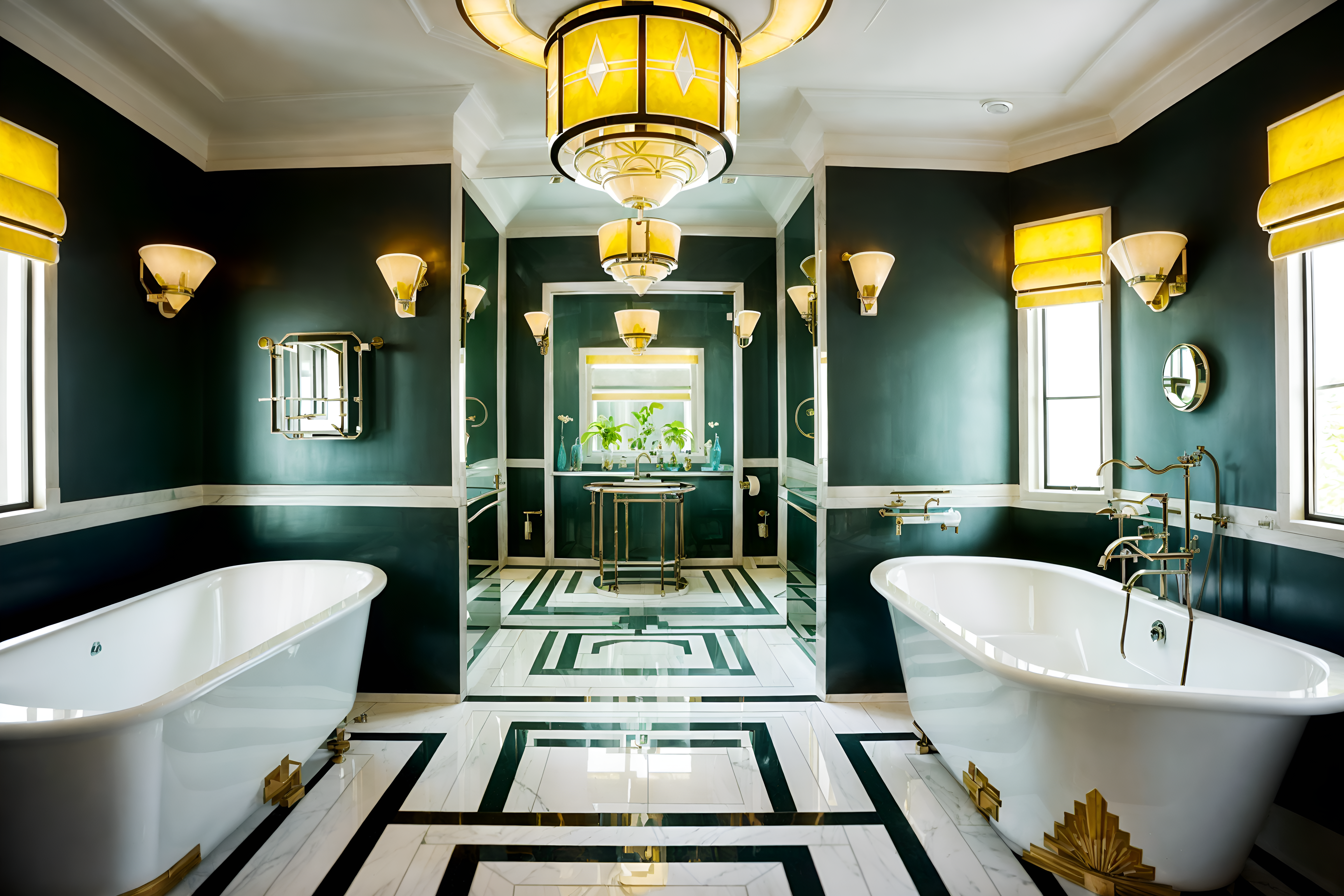 photo from pinterest of art deco-style interior designed (bathroom interior) with shower and waste basket and plant and mirror and bathtub and bathroom sink with faucet and bath rail and bathroom cabinet. . with symmetrical designs and angular shapes and bright and cheerful colors and glamour and geometric shapes and bold geometry and exuberant shapes and smooth lines. . cinematic photo, highly detailed, cinematic lighting, ultra-detailed, ultrarealistic, photorealism, 8k. trending on pinterest. art deco interior design style. masterpiece, cinematic light, ultrarealistic+, photorealistic+, 8k, raw photo, realistic, sharp focus on eyes, (symmetrical eyes), (intact eyes), hyperrealistic, highest quality, best quality, , highly detailed, masterpiece, best quality, extremely detailed 8k wallpaper, masterpiece, best quality, ultra-detailed, best shadow, detailed background, detailed face, detailed eyes, high contrast, best illumination, detailed face, dulux, caustic, dynamic angle, detailed glow. dramatic lighting. highly detailed, insanely detailed hair, symmetrical, intricate details, professionally retouched, 8k high definition. strong bokeh. award winning photo.