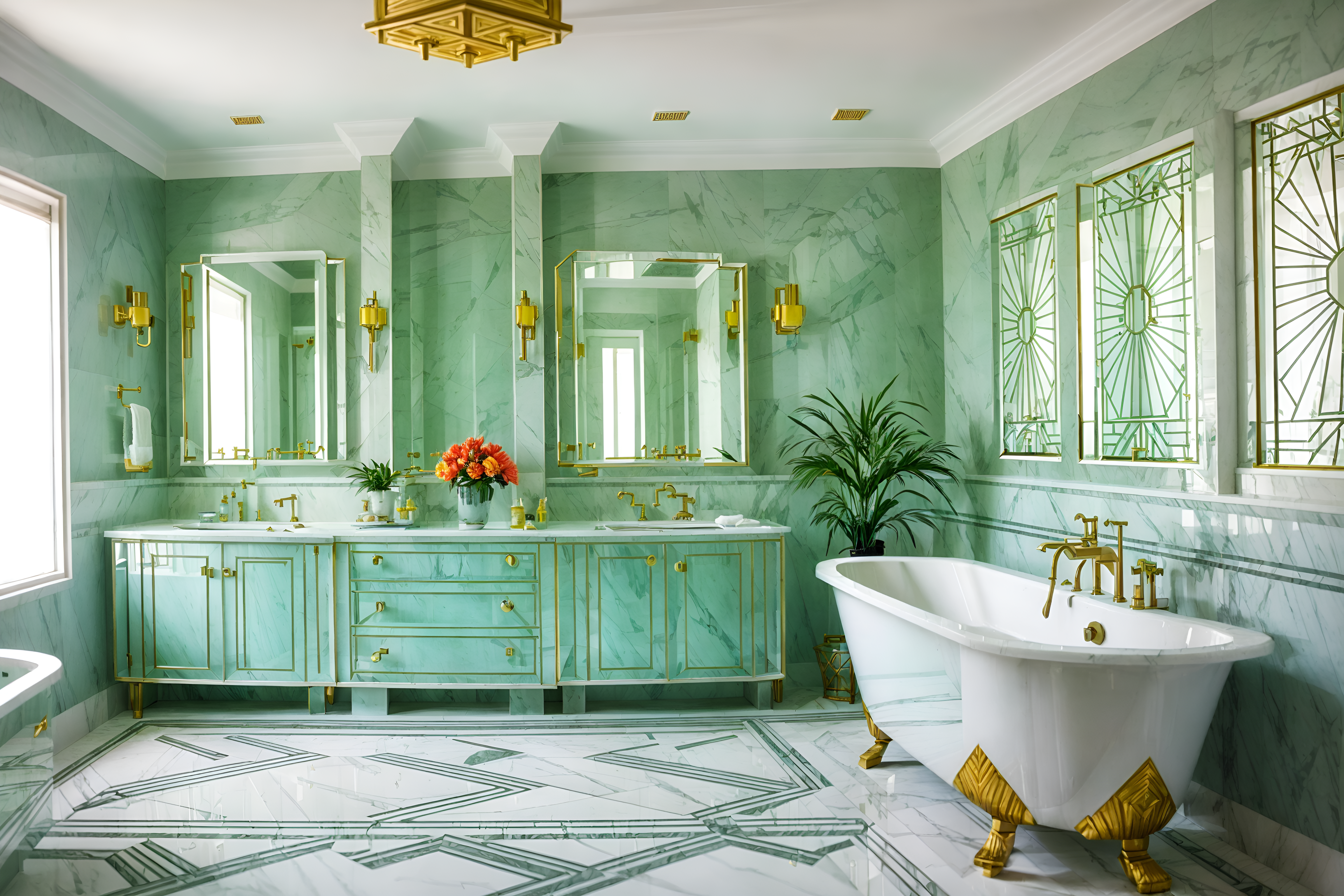 photo from pinterest of art deco-style interior designed (bathroom interior) with shower and waste basket and plant and mirror and bathtub and bathroom sink with faucet and bath rail and bathroom cabinet. . with symmetrical designs and angular shapes and bright and cheerful colors and glamour and geometric shapes and bold geometry and exuberant shapes and smooth lines. . cinematic photo, highly detailed, cinematic lighting, ultra-detailed, ultrarealistic, photorealism, 8k. trending on pinterest. art deco interior design style. masterpiece, cinematic light, ultrarealistic+, photorealistic+, 8k, raw photo, realistic, sharp focus on eyes, (symmetrical eyes), (intact eyes), hyperrealistic, highest quality, best quality, , highly detailed, masterpiece, best quality, extremely detailed 8k wallpaper, masterpiece, best quality, ultra-detailed, best shadow, detailed background, detailed face, detailed eyes, high contrast, best illumination, detailed face, dulux, caustic, dynamic angle, detailed glow. dramatic lighting. highly detailed, insanely detailed hair, symmetrical, intricate details, professionally retouched, 8k high definition. strong bokeh. award winning photo.
