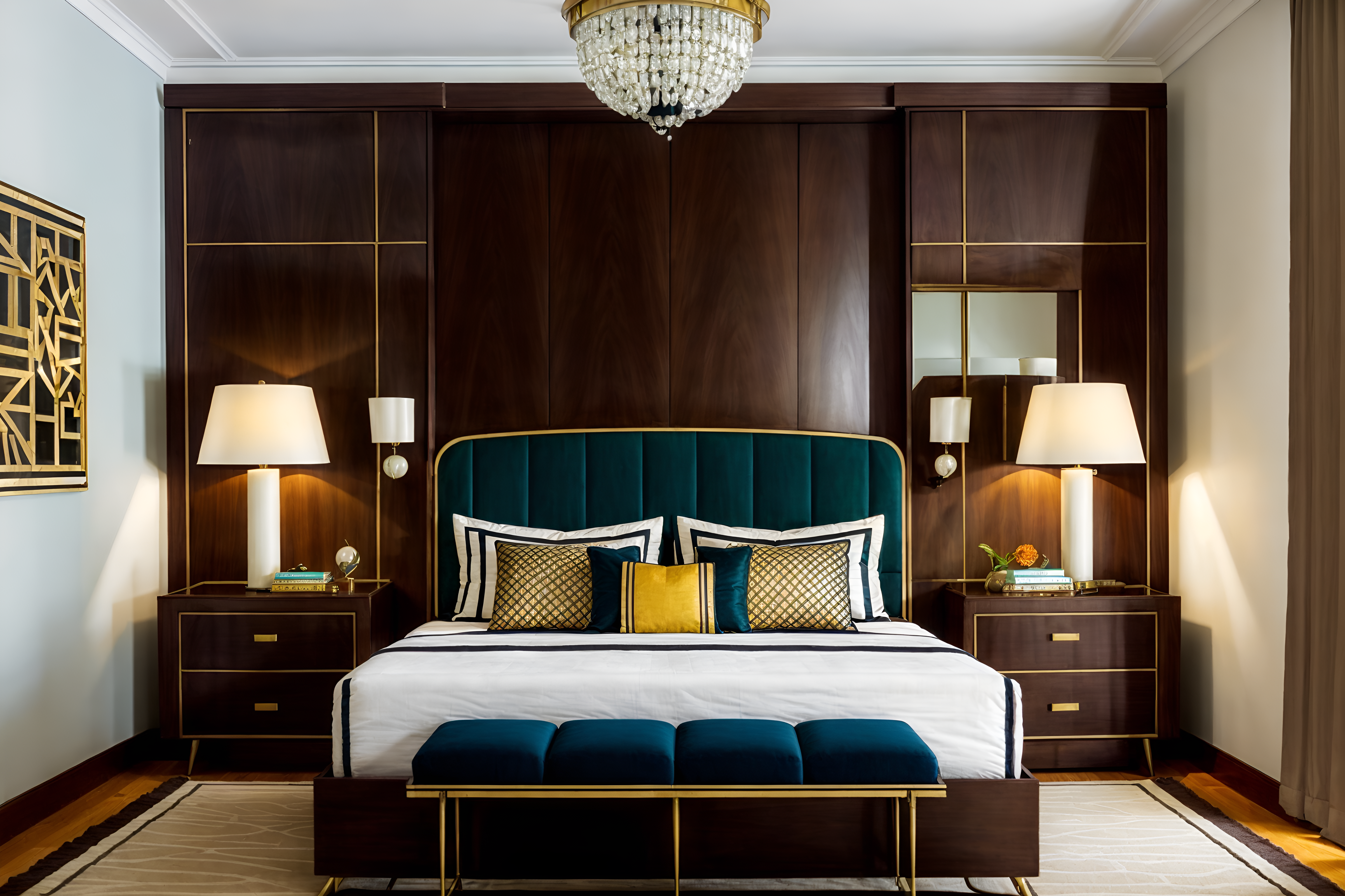 photo from pinterest of art deco-style interior designed (bedroom interior) with night light and accent chair and dresser closet and storage bench or ottoman and plant and bedside table or night stand and mirror and headboard. . with smooth lines and stream-lined forms and geometric shapes and bold geometry and rich colors and symmetrical designs and glamour and bright and cheerful colors. . cinematic photo, highly detailed, cinematic lighting, ultra-detailed, ultrarealistic, photorealism, 8k. trending on pinterest. art deco interior design style. masterpiece, cinematic light, ultrarealistic+, photorealistic+, 8k, raw photo, realistic, sharp focus on eyes, (symmetrical eyes), (intact eyes), hyperrealistic, highest quality, best quality, , highly detailed, masterpiece, best quality, extremely detailed 8k wallpaper, masterpiece, best quality, ultra-detailed, best shadow, detailed background, detailed face, detailed eyes, high contrast, best illumination, detailed face, dulux, caustic, dynamic angle, detailed glow. dramatic lighting. highly detailed, insanely detailed hair, symmetrical, intricate details, professionally retouched, 8k high definition. strong bokeh. award winning photo.