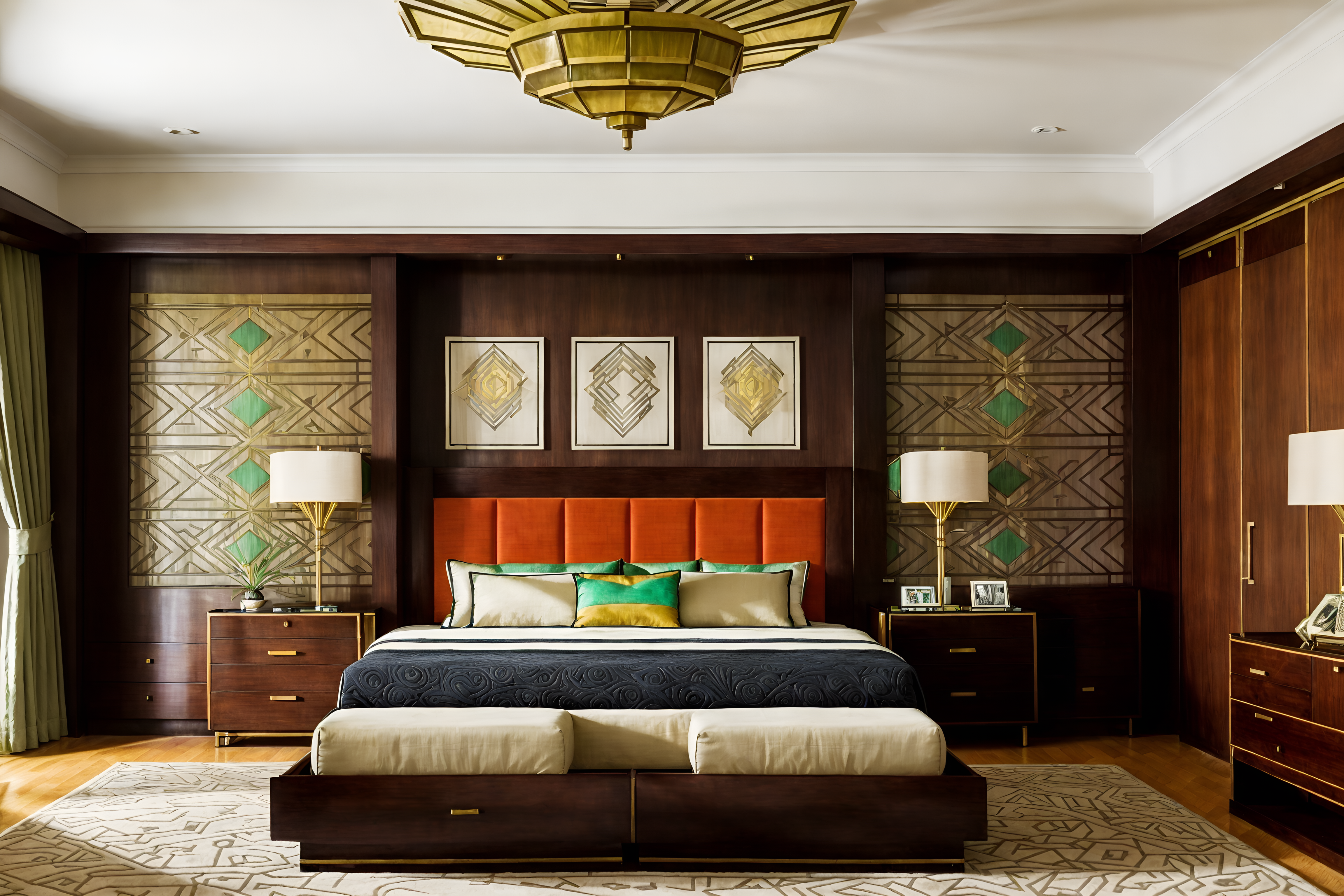 photo from pinterest of art deco-style interior designed (bedroom interior) with plant and dresser closet and storage bench or ottoman and accent chair and night light and headboard and bed and bedside table or night stand. . with glamour and geometric shapes and abstract patterns and stream-lined forms and rich colors and bright and cheerful colors and decadent detail and exuberant shapes. . cinematic photo, highly detailed, cinematic lighting, ultra-detailed, ultrarealistic, photorealism, 8k. trending on pinterest. art deco interior design style. masterpiece, cinematic light, ultrarealistic+, photorealistic+, 8k, raw photo, realistic, sharp focus on eyes, (symmetrical eyes), (intact eyes), hyperrealistic, highest quality, best quality, , highly detailed, masterpiece, best quality, extremely detailed 8k wallpaper, masterpiece, best quality, ultra-detailed, best shadow, detailed background, detailed face, detailed eyes, high contrast, best illumination, detailed face, dulux, caustic, dynamic angle, detailed glow. dramatic lighting. highly detailed, insanely detailed hair, symmetrical, intricate details, professionally retouched, 8k high definition. strong bokeh. award winning photo.