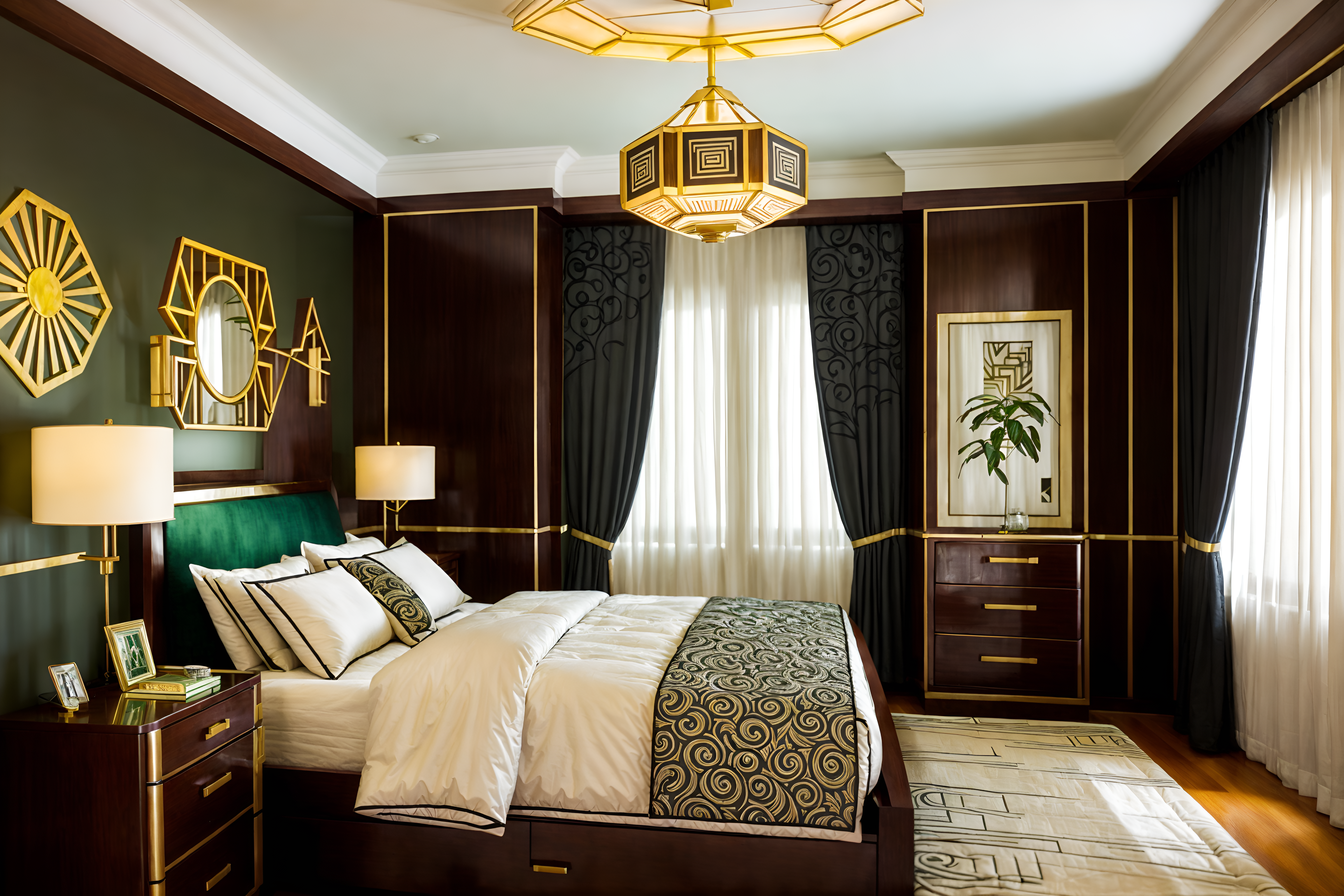 photo from pinterest of art deco-style interior designed (bedroom interior) with plant and dresser closet and storage bench or ottoman and accent chair and night light and headboard and bed and bedside table or night stand. . with glamour and geometric shapes and abstract patterns and stream-lined forms and rich colors and bright and cheerful colors and decadent detail and exuberant shapes. . cinematic photo, highly detailed, cinematic lighting, ultra-detailed, ultrarealistic, photorealism, 8k. trending on pinterest. art deco interior design style. masterpiece, cinematic light, ultrarealistic+, photorealistic+, 8k, raw photo, realistic, sharp focus on eyes, (symmetrical eyes), (intact eyes), hyperrealistic, highest quality, best quality, , highly detailed, masterpiece, best quality, extremely detailed 8k wallpaper, masterpiece, best quality, ultra-detailed, best shadow, detailed background, detailed face, detailed eyes, high contrast, best illumination, detailed face, dulux, caustic, dynamic angle, detailed glow. dramatic lighting. highly detailed, insanely detailed hair, symmetrical, intricate details, professionally retouched, 8k high definition. strong bokeh. award winning photo.