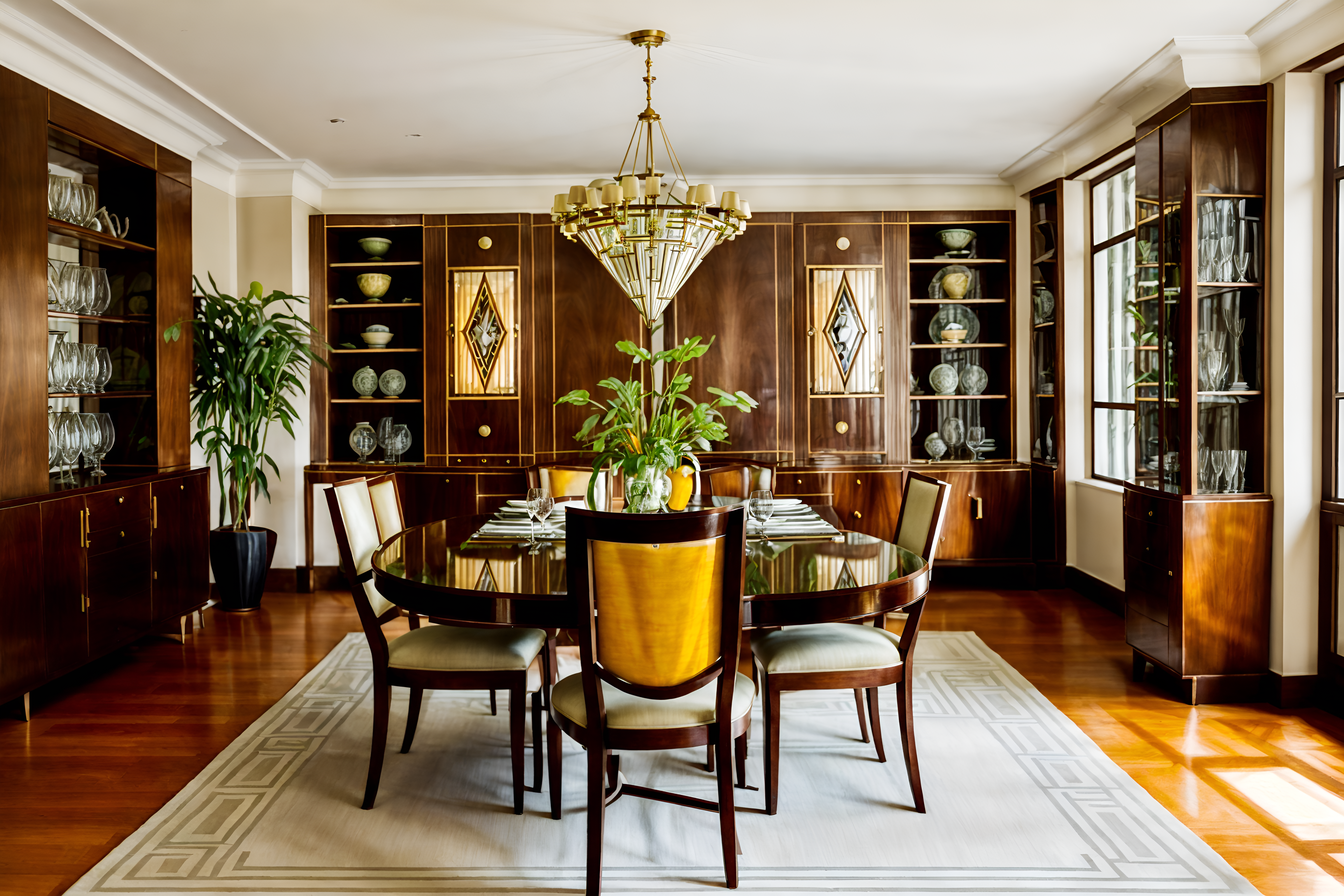 photo from pinterest of art deco-style interior designed (dining room interior) with plant and dining table and bookshelves and light or chandelier and vase and painting or photo on wall and plates, cutlery and glasses on dining table and dining table chairs. . with geometric shapes and angular shapes and symmetrical designs and stream-lined forms and decadent detail and smooth lines and bold geometry and bright and cheerful colors. . cinematic photo, highly detailed, cinematic lighting, ultra-detailed, ultrarealistic, photorealism, 8k. trending on pinterest. art deco interior design style. masterpiece, cinematic light, ultrarealistic+, photorealistic+, 8k, raw photo, realistic, sharp focus on eyes, (symmetrical eyes), (intact eyes), hyperrealistic, highest quality, best quality, , highly detailed, masterpiece, best quality, extremely detailed 8k wallpaper, masterpiece, best quality, ultra-detailed, best shadow, detailed background, detailed face, detailed eyes, high contrast, best illumination, detailed face, dulux, caustic, dynamic angle, detailed glow. dramatic lighting. highly detailed, insanely detailed hair, symmetrical, intricate details, professionally retouched, 8k high definition. strong bokeh. award winning photo.
