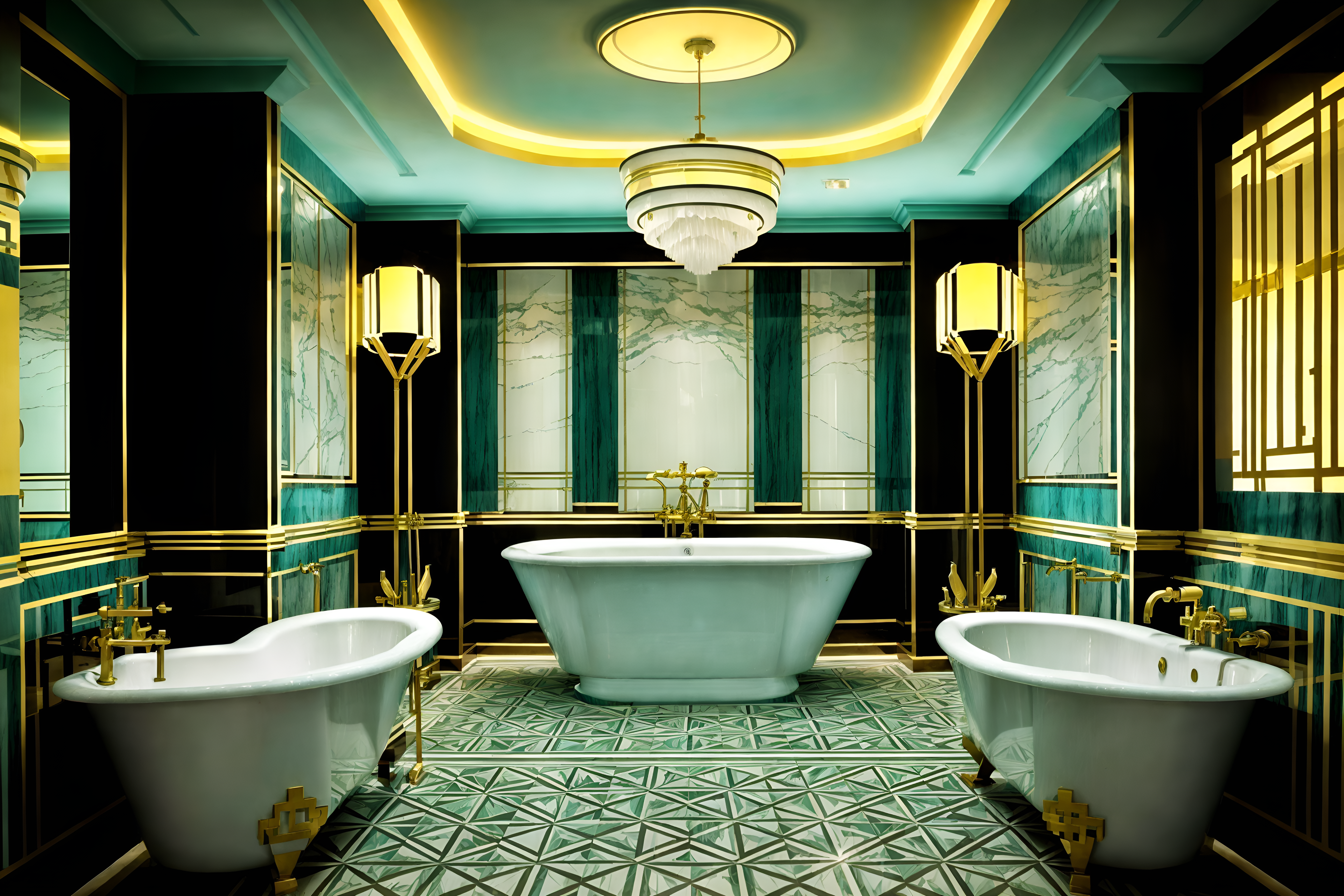 photo from pinterest of art deco-style interior designed (hotel bathroom interior) with waste basket and bathtub and mirror and toilet seat and shower and bathroom sink with faucet and bathroom cabinet and bath towel. . with abstract patterns and luxury and bold geometry and glamour and bright and cheerful colors and stream-lined forms and geometric lines and decadent detail. . cinematic photo, highly detailed, cinematic lighting, ultra-detailed, ultrarealistic, photorealism, 8k. trending on pinterest. art deco interior design style. masterpiece, cinematic light, ultrarealistic+, photorealistic+, 8k, raw photo, realistic, sharp focus on eyes, (symmetrical eyes), (intact eyes), hyperrealistic, highest quality, best quality, , highly detailed, masterpiece, best quality, extremely detailed 8k wallpaper, masterpiece, best quality, ultra-detailed, best shadow, detailed background, detailed face, detailed eyes, high contrast, best illumination, detailed face, dulux, caustic, dynamic angle, detailed glow. dramatic lighting. highly detailed, insanely detailed hair, symmetrical, intricate details, professionally retouched, 8k high definition. strong bokeh. award winning photo.