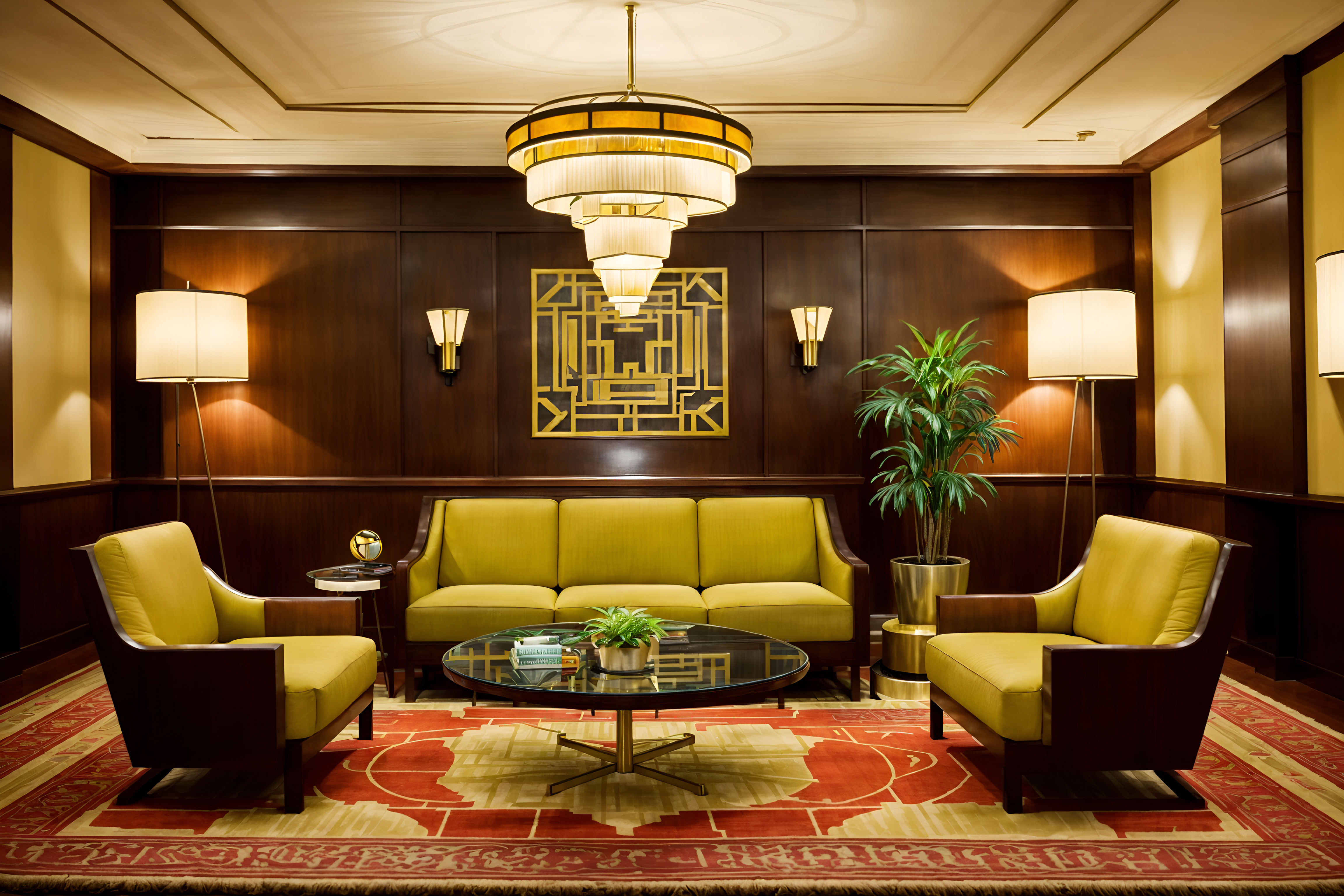 art deco hotel lobbysinterior decorate this hotel lobby with art deco style. . . with check in desk and sofas and coffee tables and rug and lounge chairs and furniture and plant and hanging lamps. . with glamour and geometric shapes and abstract patterns and bold geometry and bright and cheerful colors and exuberant shapes and stream-lined forms and angular shapes. . .