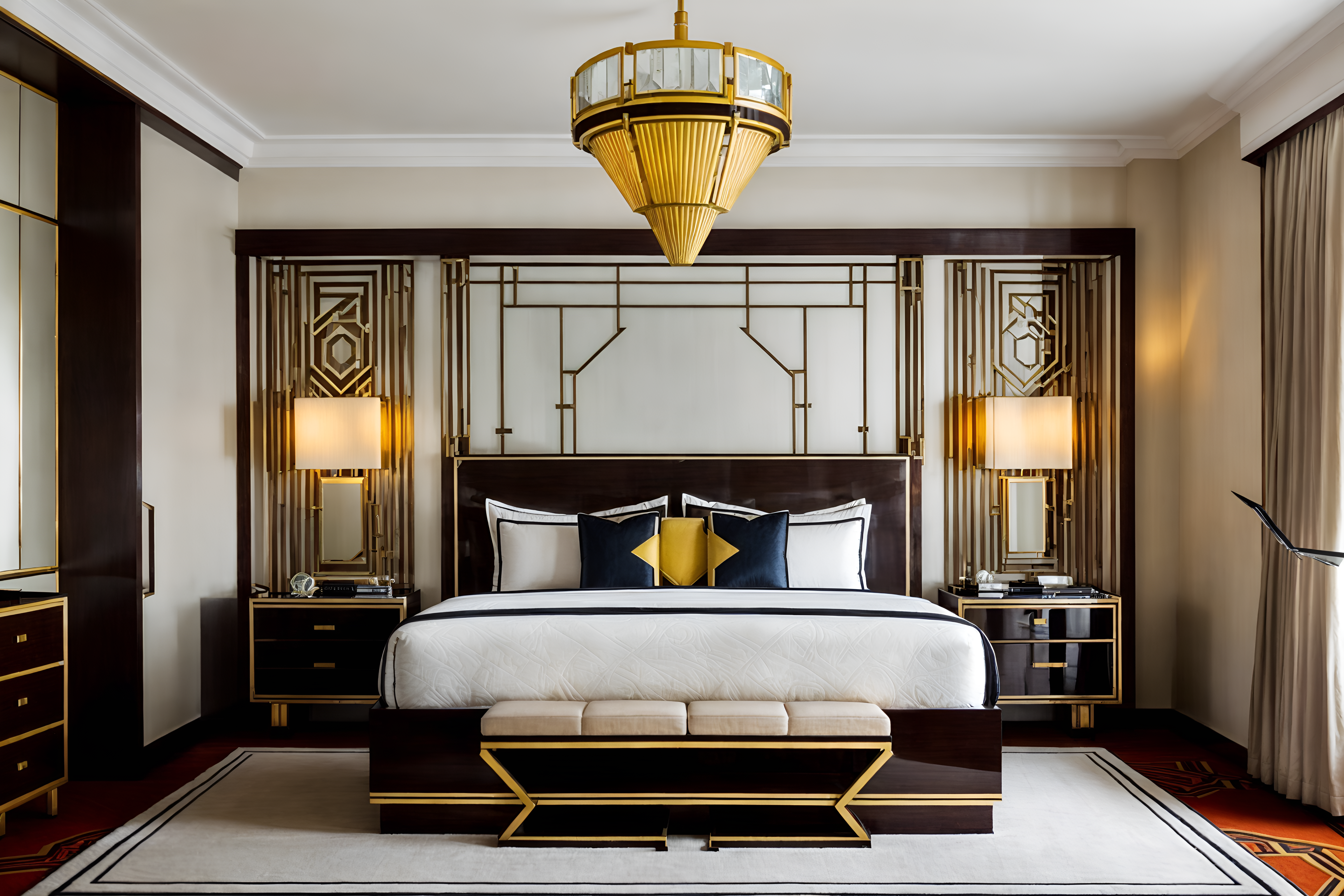 photo from pinterest of art deco-style interior designed (hotel room interior) with headboard and hotel bathroom and accent chair and storage bench or ottoman and bedside table or night stand and mirror and bed and working desk with desk chair. . with angular shapes and abstract patterns and geometric lines and luxury and stream-lined forms and exuberant shapes and symmetrical designs and bold geometry. . cinematic photo, highly detailed, cinematic lighting, ultra-detailed, ultrarealistic, photorealism, 8k. trending on pinterest. art deco interior design style. masterpiece, cinematic light, ultrarealistic+, photorealistic+, 8k, raw photo, realistic, sharp focus on eyes, (symmetrical eyes), (intact eyes), hyperrealistic, highest quality, best quality, , highly detailed, masterpiece, best quality, extremely detailed 8k wallpaper, masterpiece, best quality, ultra-detailed, best shadow, detailed background, detailed face, detailed eyes, high contrast, best illumination, detailed face, dulux, caustic, dynamic angle, detailed glow. dramatic lighting. highly detailed, insanely detailed hair, symmetrical, intricate details, professionally retouched, 8k high definition. strong bokeh. award winning photo.