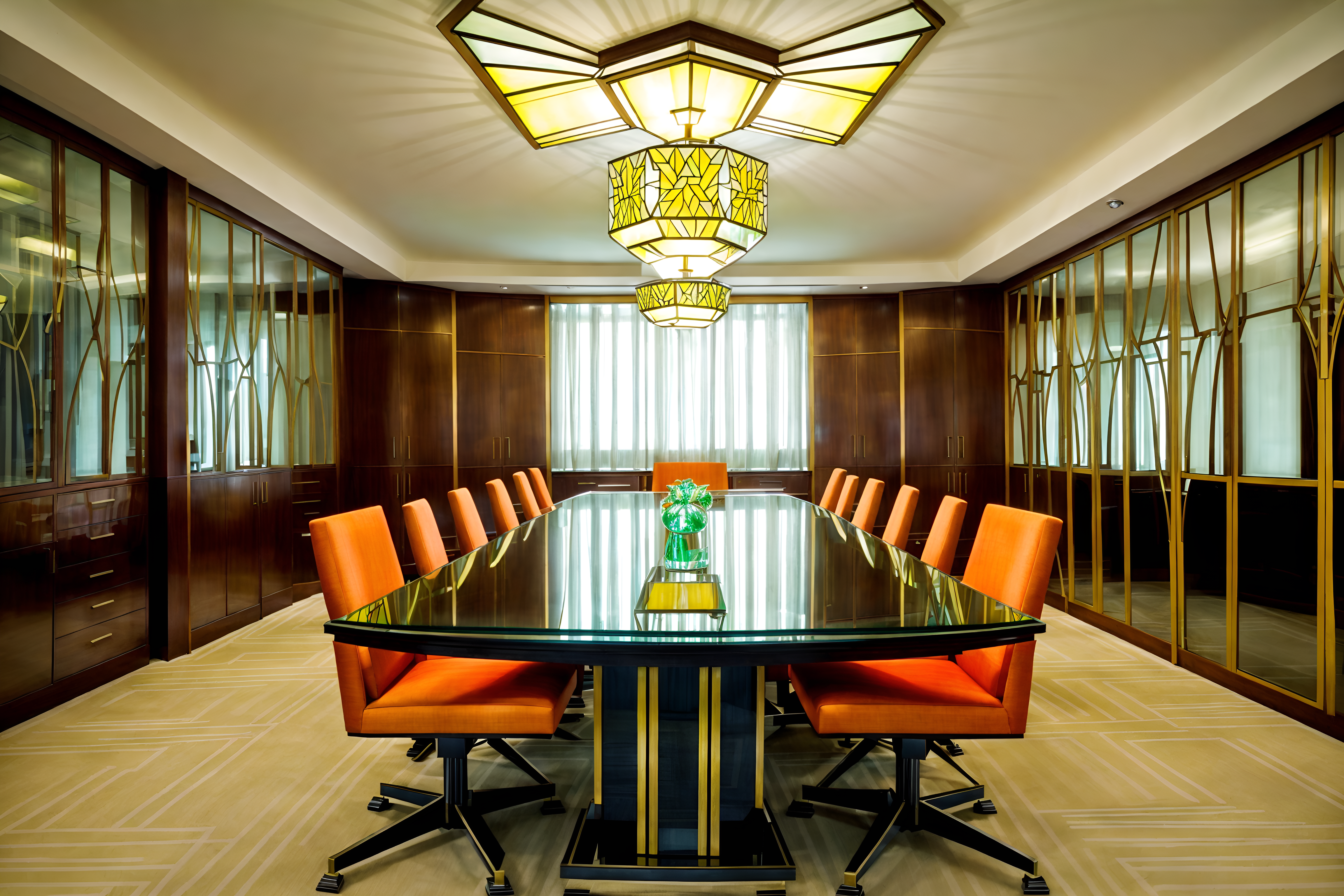 photo from pinterest of art deco-style interior designed (meeting room interior) with glass doors and glass walls and cabinets and vase and boardroom table and plant and office chairs and painting or photo on wall. . with stream-lined forms and exuberant shapes and geometric shapes and abstract patterns and bright and cheerful colors and angular shapes and rich colors and glamour. . cinematic photo, highly detailed, cinematic lighting, ultra-detailed, ultrarealistic, photorealism, 8k. trending on pinterest. art deco interior design style. masterpiece, cinematic light, ultrarealistic+, photorealistic+, 8k, raw photo, realistic, sharp focus on eyes, (symmetrical eyes), (intact eyes), hyperrealistic, highest quality, best quality, , highly detailed, masterpiece, best quality, extremely detailed 8k wallpaper, masterpiece, best quality, ultra-detailed, best shadow, detailed background, detailed face, detailed eyes, high contrast, best illumination, detailed face, dulux, caustic, dynamic angle, detailed glow. dramatic lighting. highly detailed, insanely detailed hair, symmetrical, intricate details, professionally retouched, 8k high definition. strong bokeh. award winning photo.