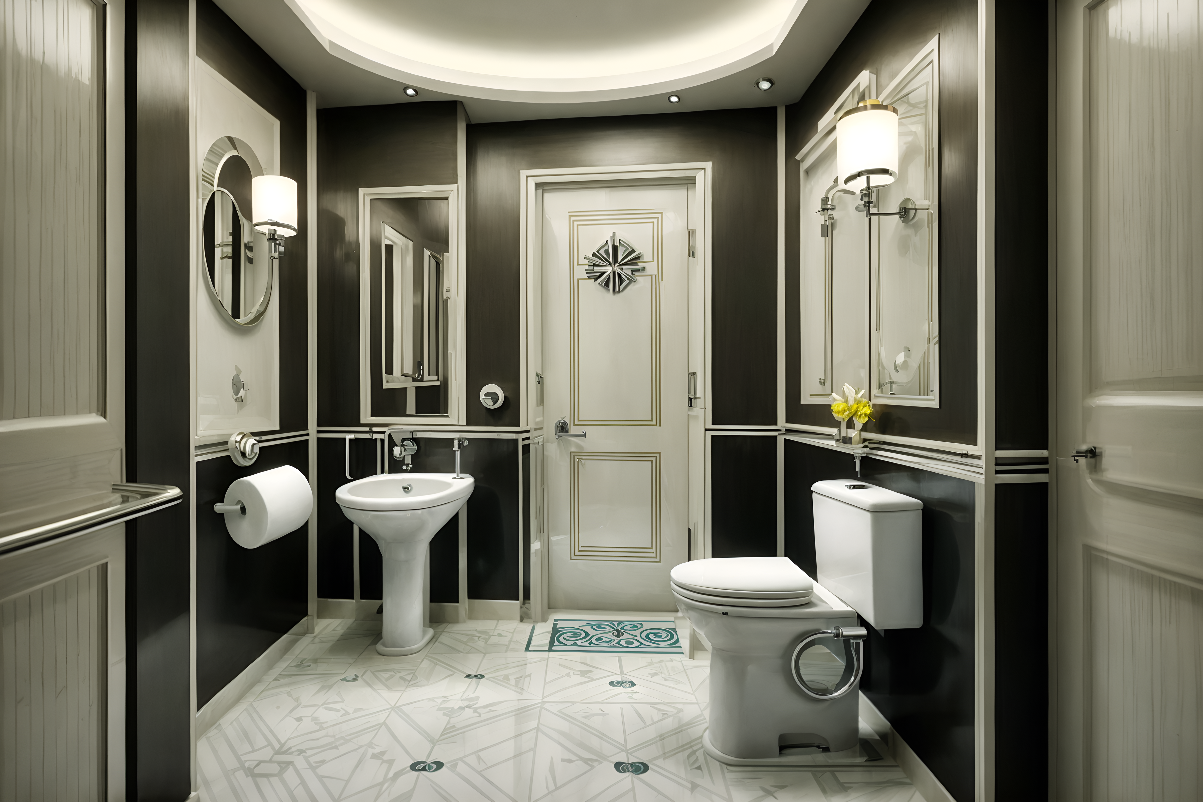 art deco toiletsinterior decorate this toilet with art deco style. . . with toilet with toilet seat up and toilet paper hanger and sink with tap and toilet with toilet seat up. . with abstract patterns and bold geometry and stream-lined forms and glamour and bright and cheerful colors and decadent detail and luxury and smooth lines. . .