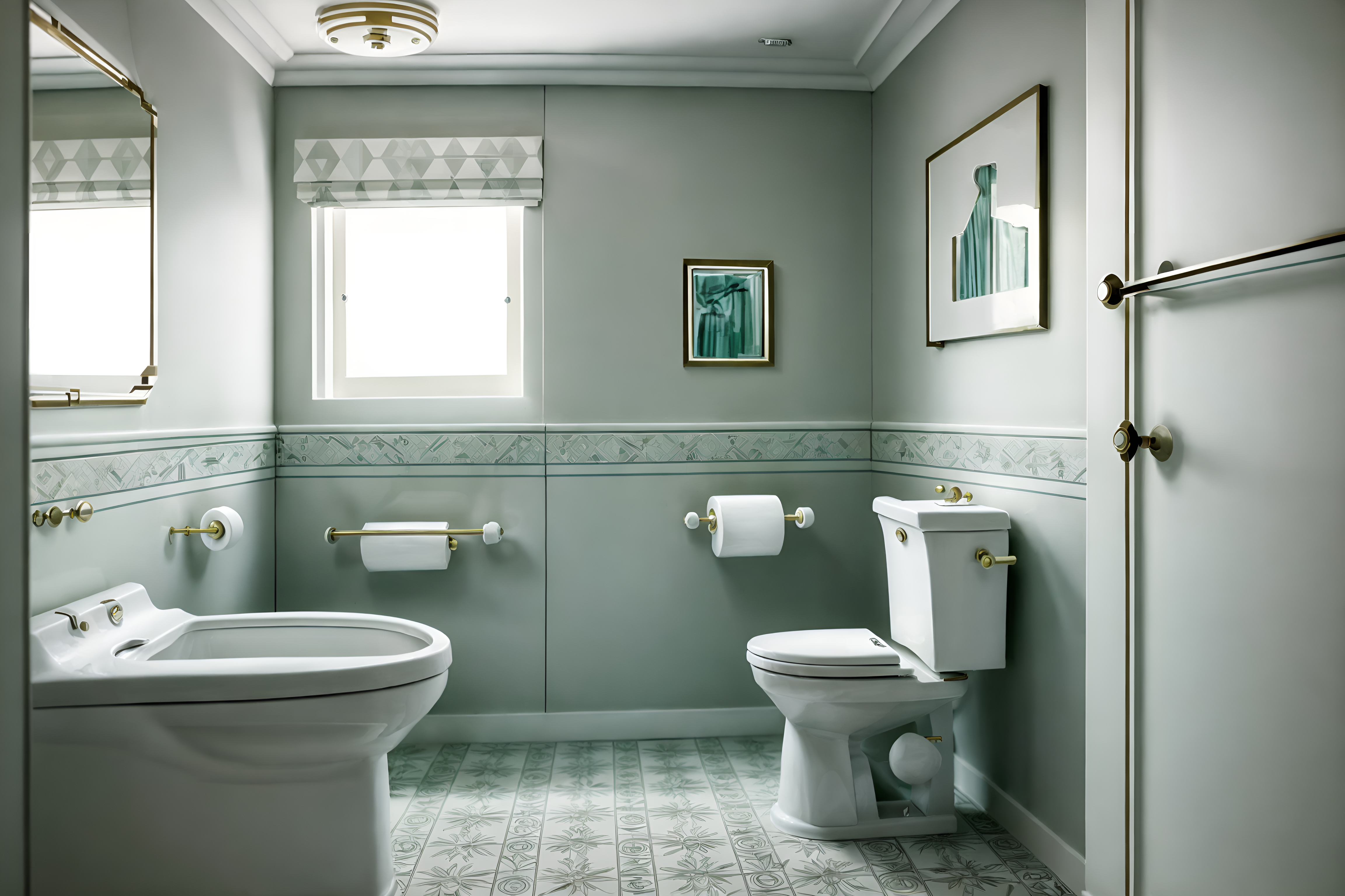 photo from pinterest of art deco-style interior designed (toilet interior) with toilet with toilet seat up and sink with tap and toilet paper hanger and toilet with toilet seat up. . with smooth lines and bold geometry and geometric lines and bright and cheerful colors and luxury and glamour and stream-lined forms and decadent detail. . cinematic photo, highly detailed, cinematic lighting, ultra-detailed, ultrarealistic, photorealism, 8k. trending on pinterest. art deco interior design style. masterpiece, cinematic light, ultrarealistic+, photorealistic+, 8k, raw photo, realistic, sharp focus on eyes, (symmetrical eyes), (intact eyes), hyperrealistic, highest quality, best quality, , highly detailed, masterpiece, best quality, extremely detailed 8k wallpaper, masterpiece, best quality, ultra-detailed, best shadow, detailed background, detailed face, detailed eyes, high contrast, best illumination, detailed face, dulux, caustic, dynamic angle, detailed glow. dramatic lighting. highly detailed, insanely detailed hair, symmetrical, intricate details, professionally retouched, 8k high definition. strong bokeh. award winning photo.