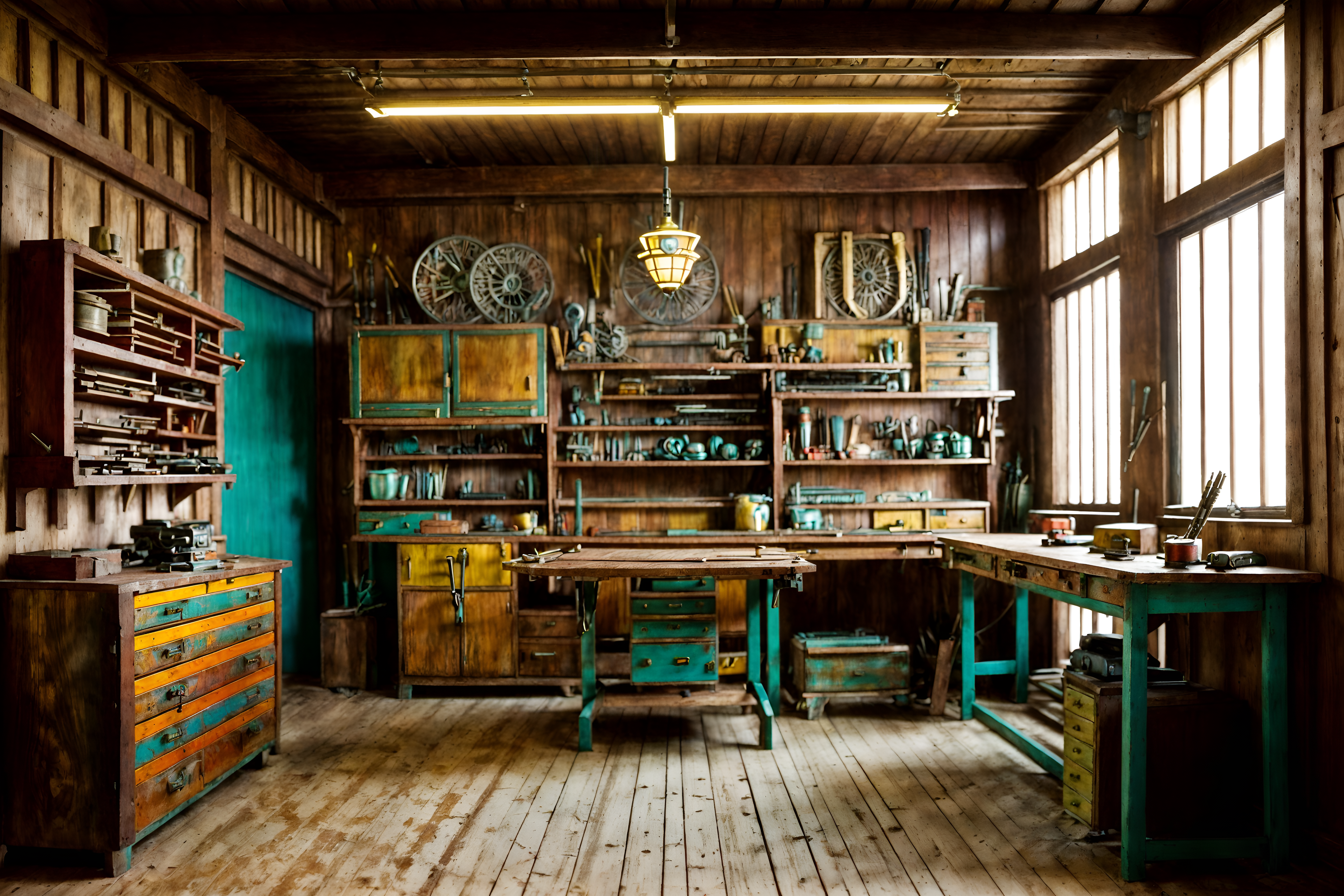 photo from pinterest of art deco-style interior designed (workshop interior) with wooden workbench and messy and tool wall and wooden workbench. . with abstract patterns and glamour and bright and cheerful colors and rich colors and stream-lined forms and bold geometry and symmetrical designs and smooth lines. . cinematic photo, highly detailed, cinematic lighting, ultra-detailed, ultrarealistic, photorealism, 8k. trending on pinterest. art deco interior design style. masterpiece, cinematic light, ultrarealistic+, photorealistic+, 8k, raw photo, realistic, sharp focus on eyes, (symmetrical eyes), (intact eyes), hyperrealistic, highest quality, best quality, , highly detailed, masterpiece, best quality, extremely detailed 8k wallpaper, masterpiece, best quality, ultra-detailed, best shadow, detailed background, detailed face, detailed eyes, high contrast, best illumination, detailed face, dulux, caustic, dynamic angle, detailed glow. dramatic lighting. highly detailed, insanely detailed hair, symmetrical, intricate details, professionally retouched, 8k high definition. strong bokeh. award winning photo.