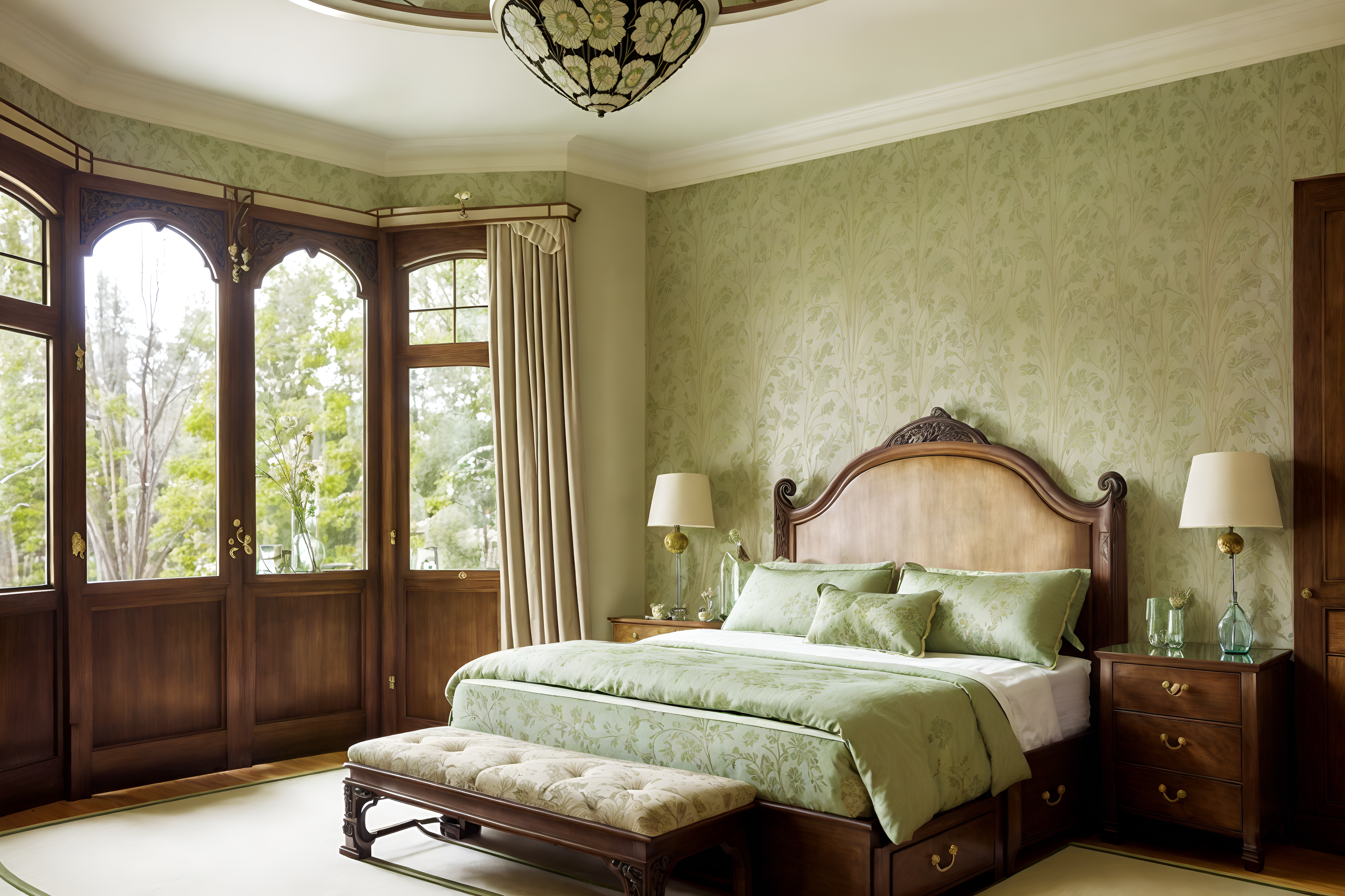 photo from pinterest of art nouveau-style interior designed (bedroom interior) with accent chair and mirror and storage bench or ottoman and dresser closet and bedside table or night stand and headboard and bed and night light. . with natural materials and curving, plant-like embellishments and curved glass and arches and curved forms and wallpaper patterns of stylized flowers and soft, rounded lines and japanese motifs and wallpaper patterns of feathers. . cinematic photo, highly detailed, cinematic lighting, ultra-detailed, ultrarealistic, photorealism, 8k. trending on pinterest. art nouveau interior design style. masterpiece, cinematic light, ultrarealistic+, photorealistic+, 8k, raw photo, realistic, sharp focus on eyes, (symmetrical eyes), (intact eyes), hyperrealistic, highest quality, best quality, , highly detailed, masterpiece, best quality, extremely detailed 8k wallpaper, masterpiece, best quality, ultra-detailed, best shadow, detailed background, detailed face, detailed eyes, high contrast, best illumination, detailed face, dulux, caustic, dynamic angle, detailed glow. dramatic lighting. highly detailed, insanely detailed hair, symmetrical, intricate details, professionally retouched, 8k high definition. strong bokeh. award winning photo.