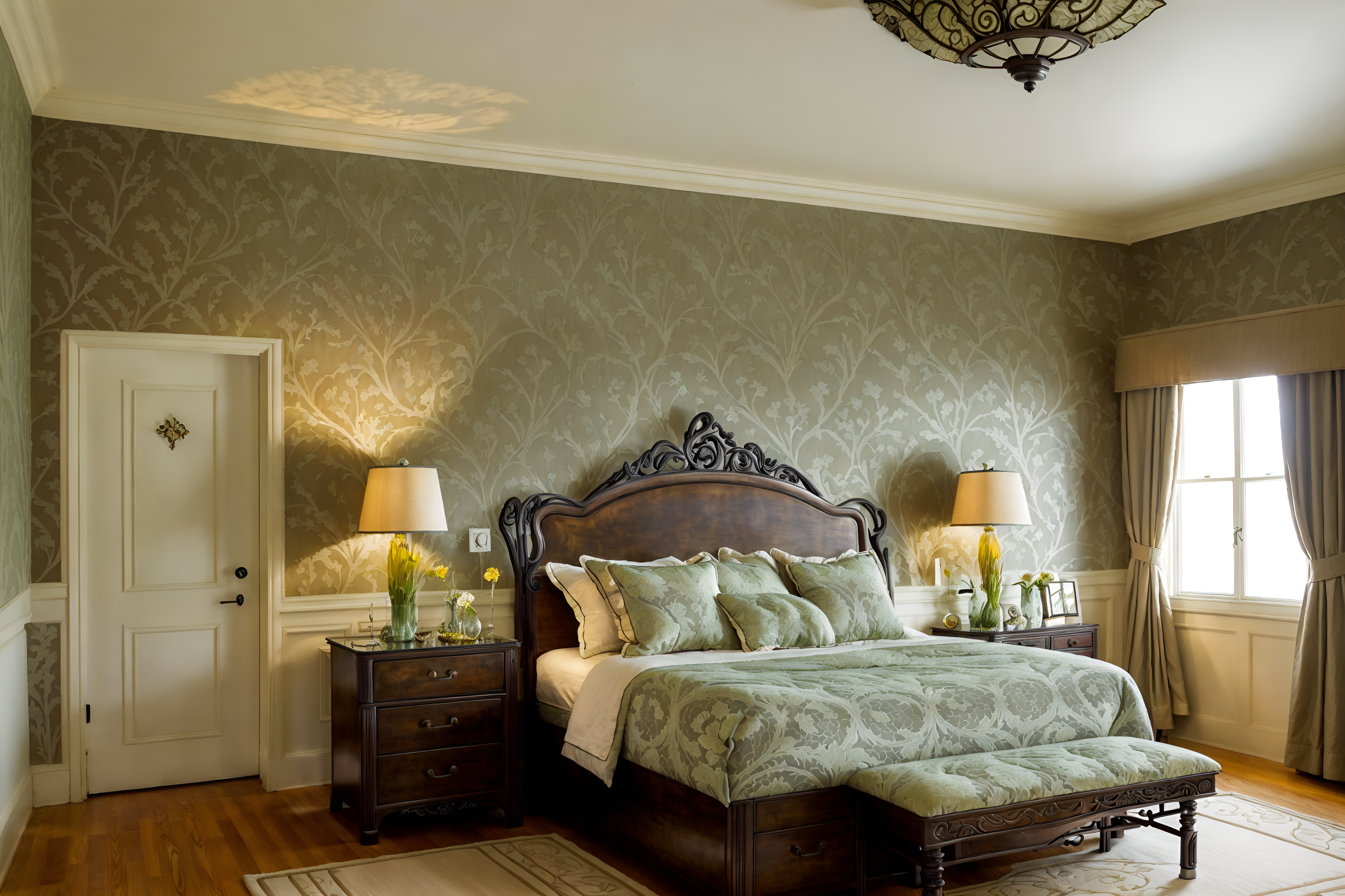 photo from pinterest of art nouveau-style interior designed (bedroom interior) with accent chair and mirror and storage bench or ottoman and dresser closet and bedside table or night stand and headboard and bed and night light. . with natural materials and curving, plant-like embellishments and curved glass and arches and curved forms and wallpaper patterns of stylized flowers and soft, rounded lines and japanese motifs and wallpaper patterns of feathers. . cinematic photo, highly detailed, cinematic lighting, ultra-detailed, ultrarealistic, photorealism, 8k. trending on pinterest. art nouveau interior design style. masterpiece, cinematic light, ultrarealistic+, photorealistic+, 8k, raw photo, realistic, sharp focus on eyes, (symmetrical eyes), (intact eyes), hyperrealistic, highest quality, best quality, , highly detailed, masterpiece, best quality, extremely detailed 8k wallpaper, masterpiece, best quality, ultra-detailed, best shadow, detailed background, detailed face, detailed eyes, high contrast, best illumination, detailed face, dulux, caustic, dynamic angle, detailed glow. dramatic lighting. highly detailed, insanely detailed hair, symmetrical, intricate details, professionally retouched, 8k high definition. strong bokeh. award winning photo.
